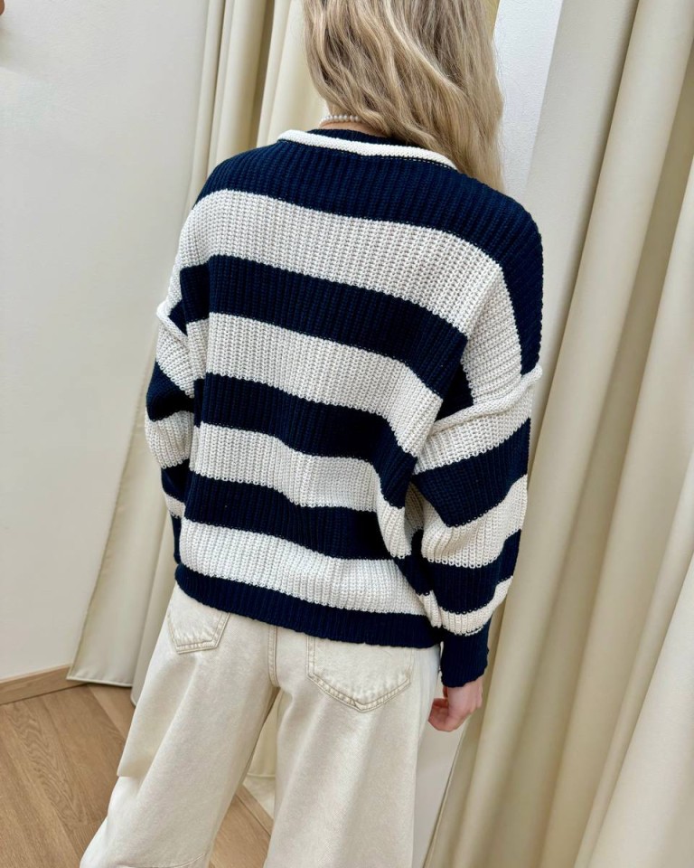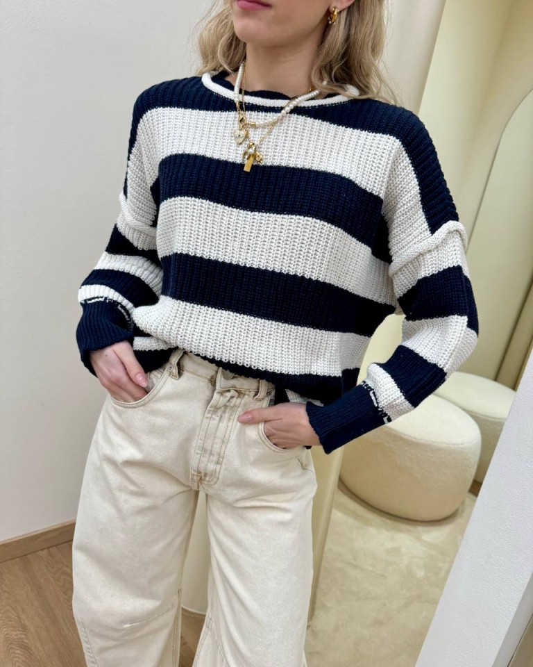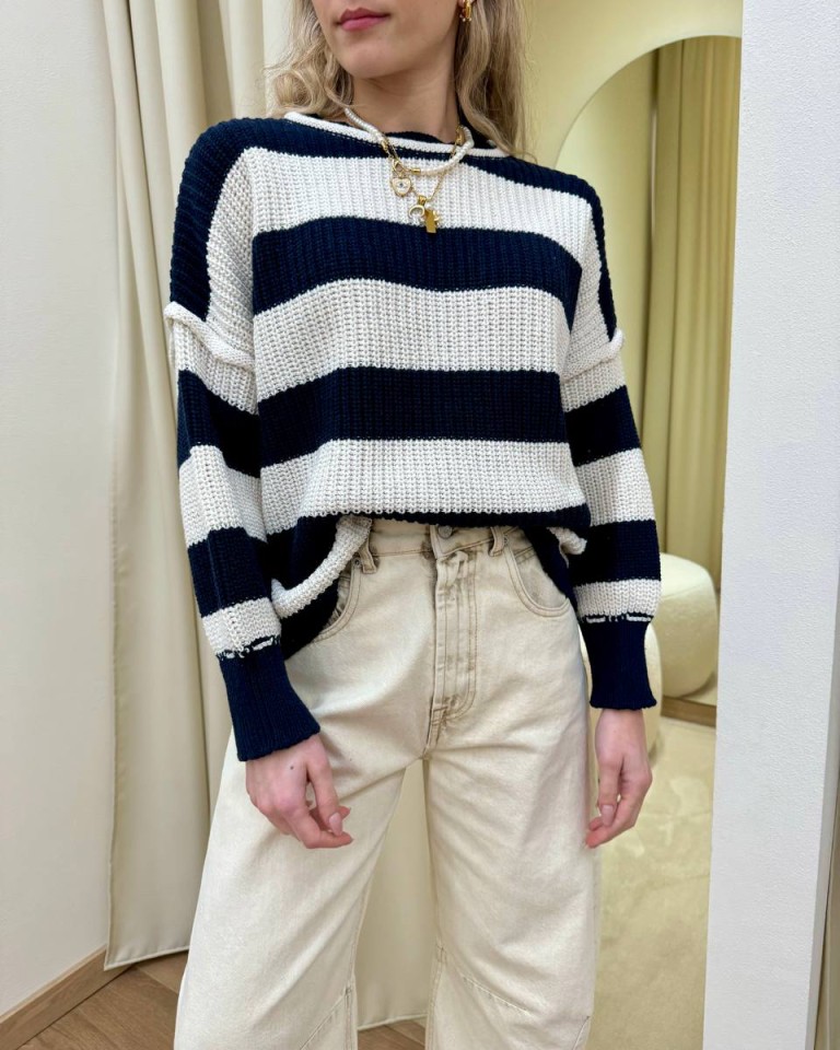 Maglione in maglia inglese a righe panna e blu, modello over a scatoletta, girocollo, manica lunga e giro sceso. Vestibilità ampia.