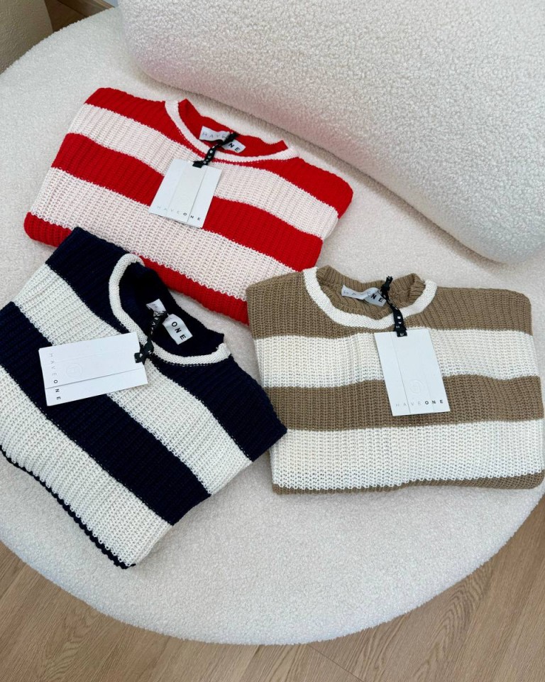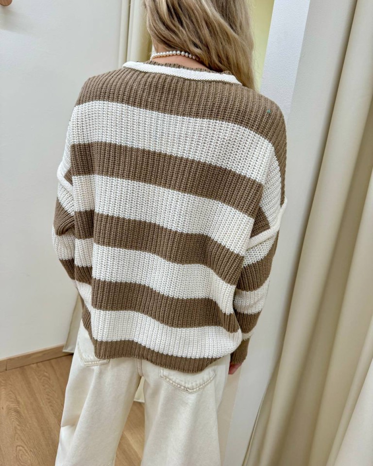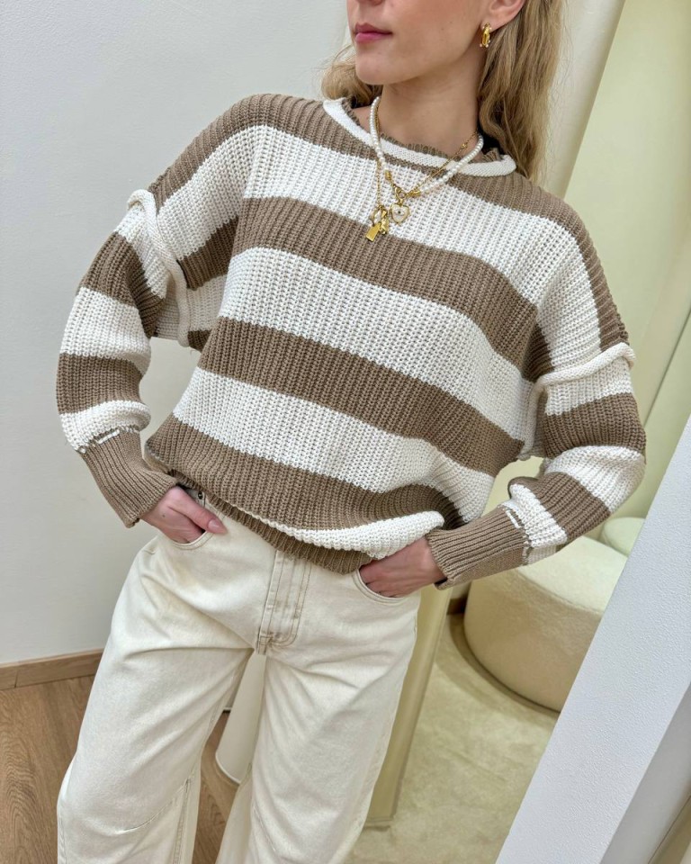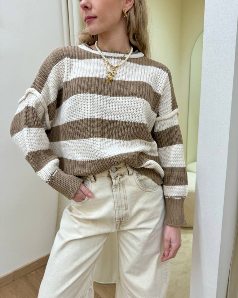 Maglione in maglia inglese a righe panna e nocciola, modello over a scatoletta, girocollo, manica lunga e giro sceso. Vestibilità ampia.
