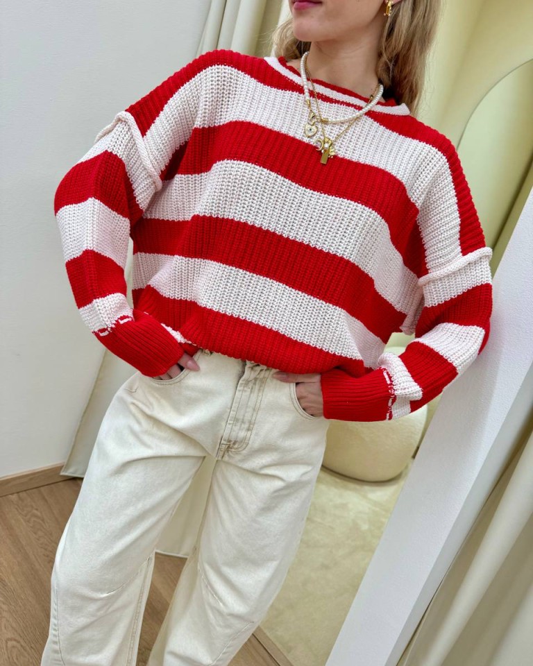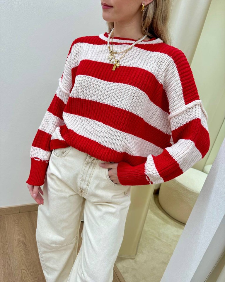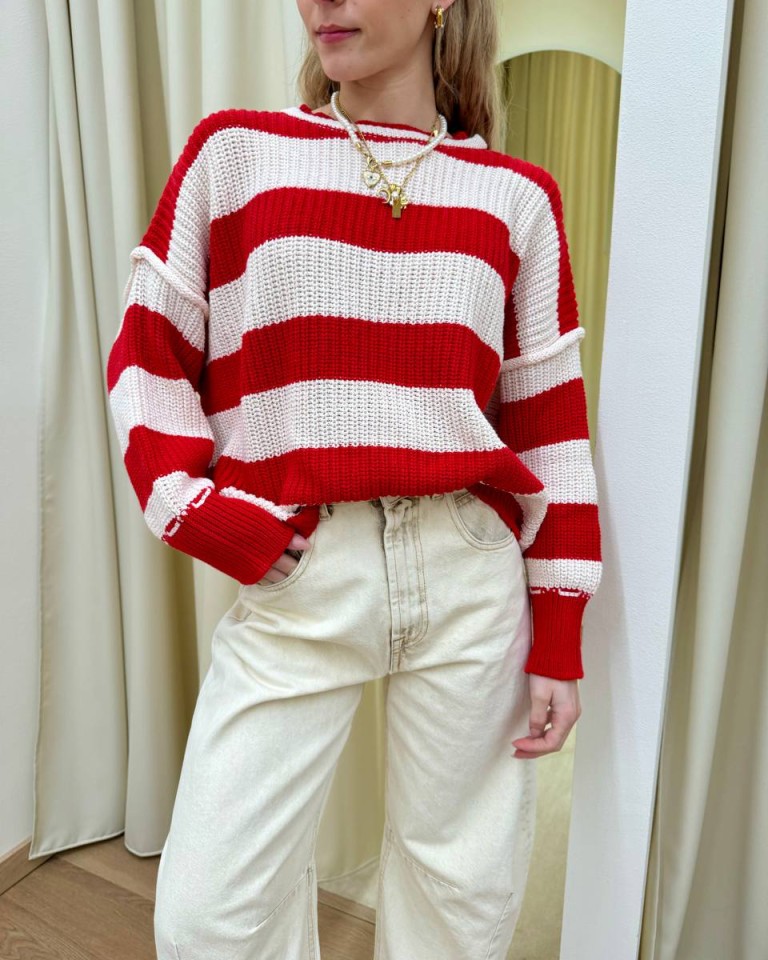 Maglione in maglia inglese a righe panna e rosso, modello over a scatoletta, girocollo, manica lunga e giro sceso. Vestibilità ampia.