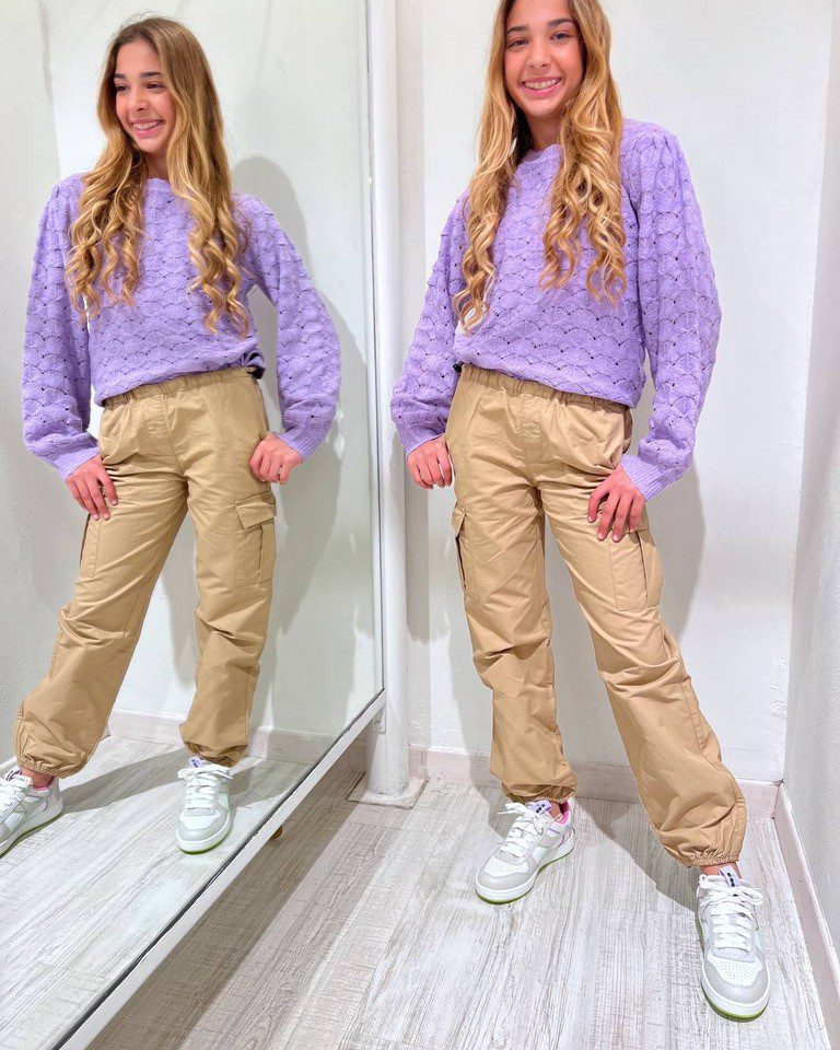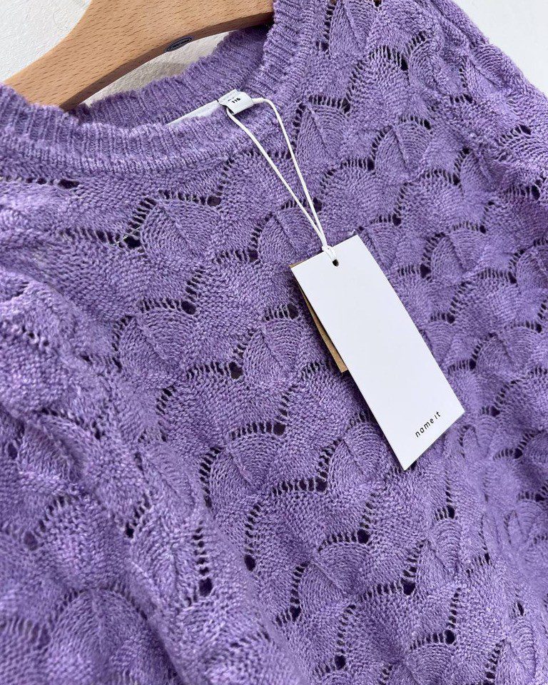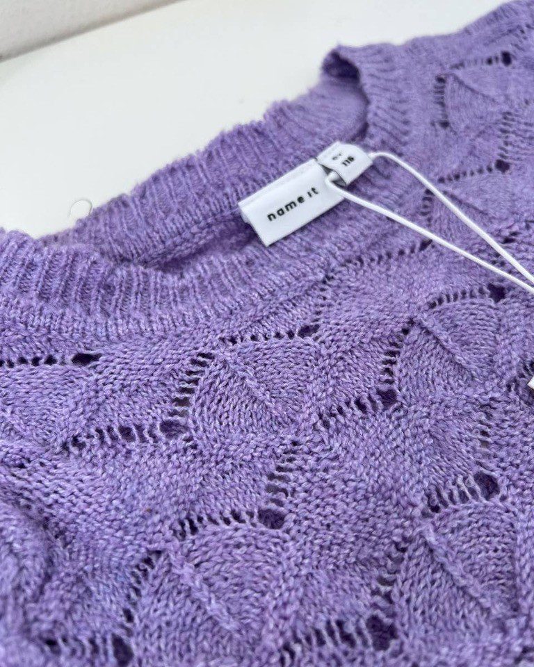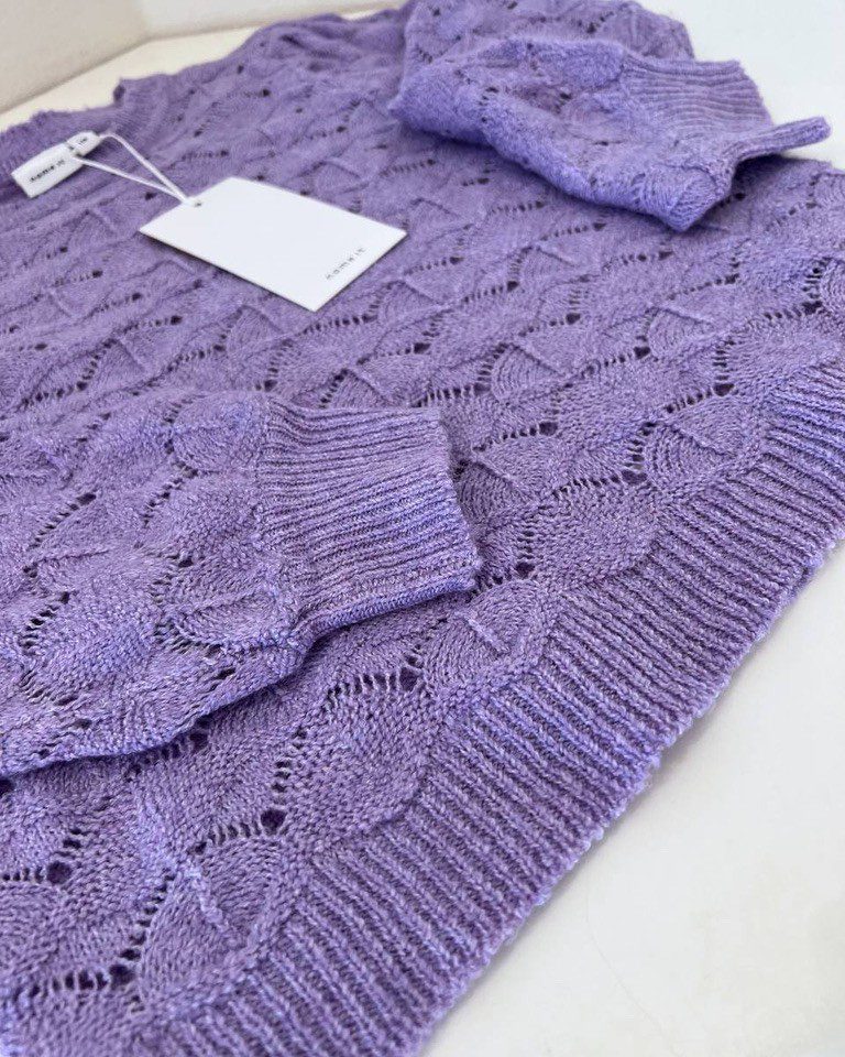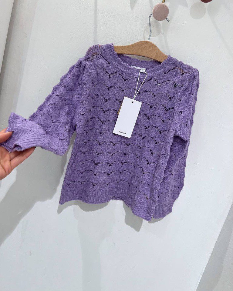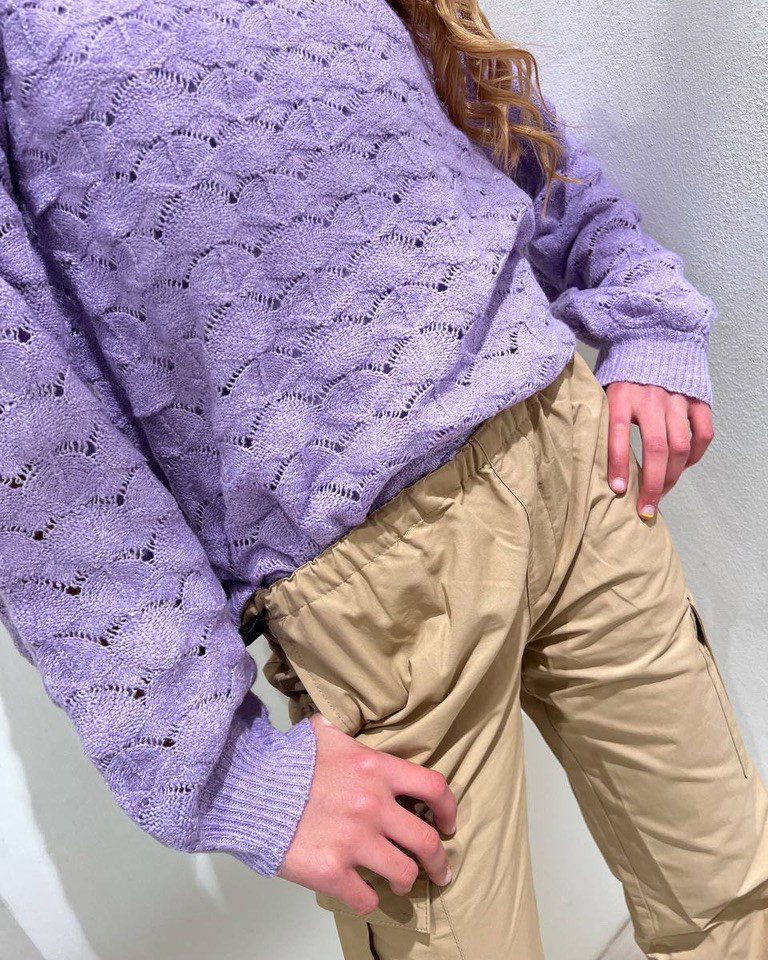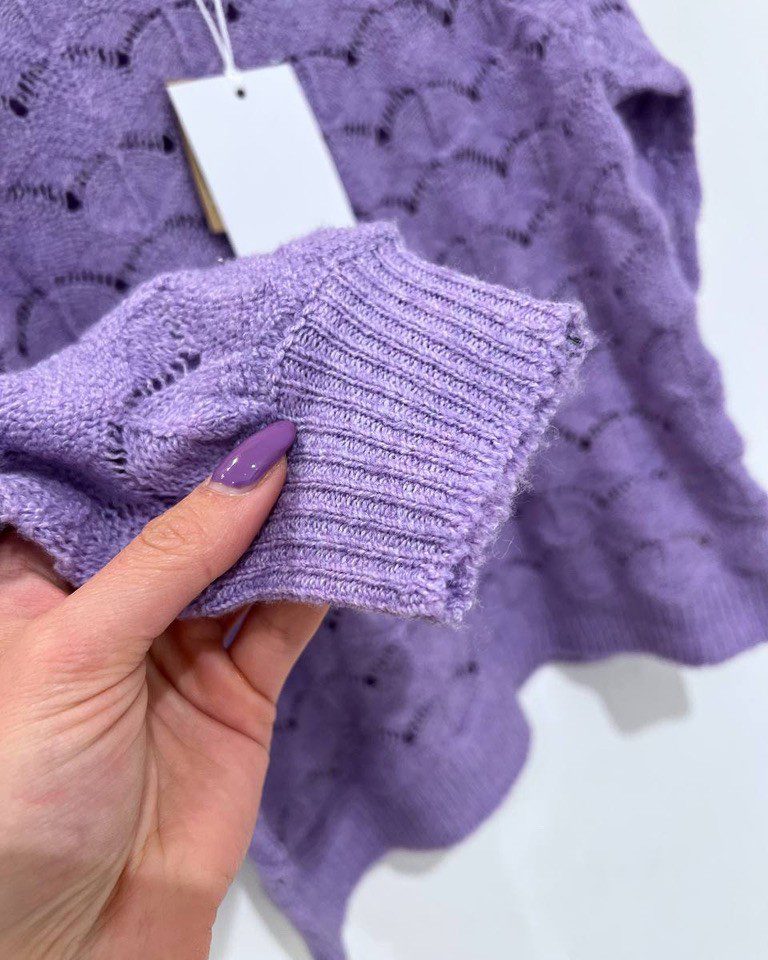 Maglione traforato lilla con lana. Modello girocollo con maniche lunghe leggermente a sbuffo, costine su scollo, fondo e polsi. Vestibilità regolare.
