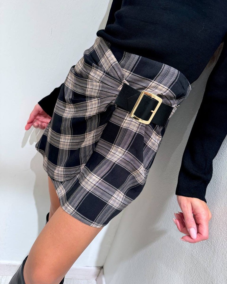 Minigonna a quadri sui toni del grigio, modello portafoglio con bottone interno e cintura laterale. Vestibilità ampia in vita.