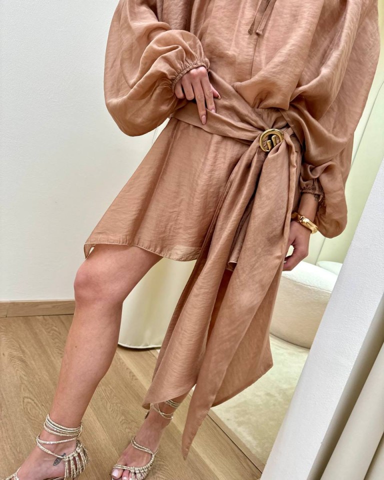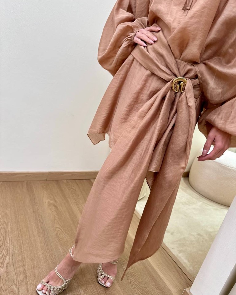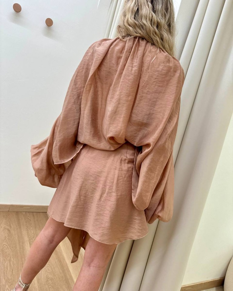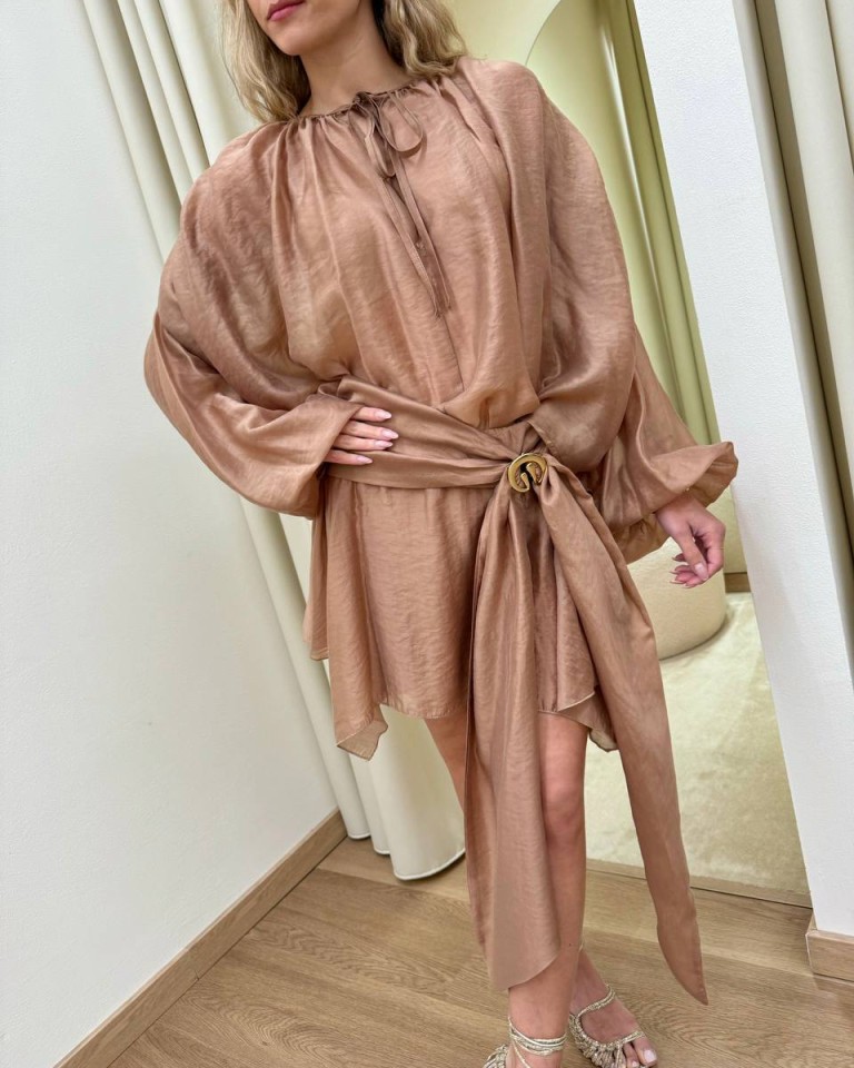 Minigonna nocciola, modello svasato, asimmetrico, con nodo davanti e dettaglio gioiello dorato, chiusura con zip laterale. Vestibilità regolare.