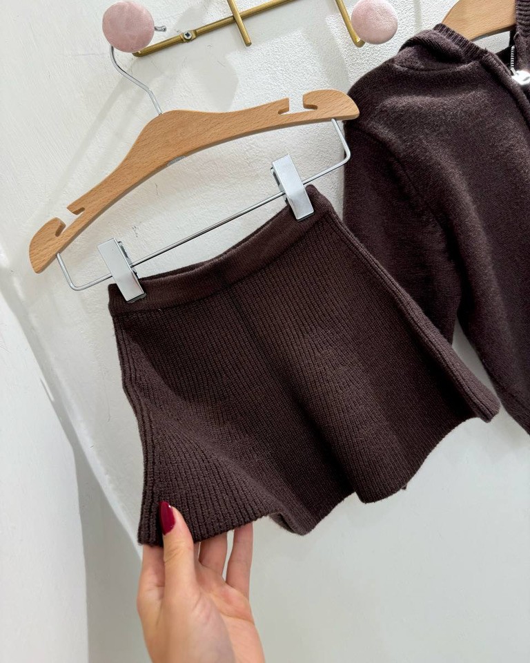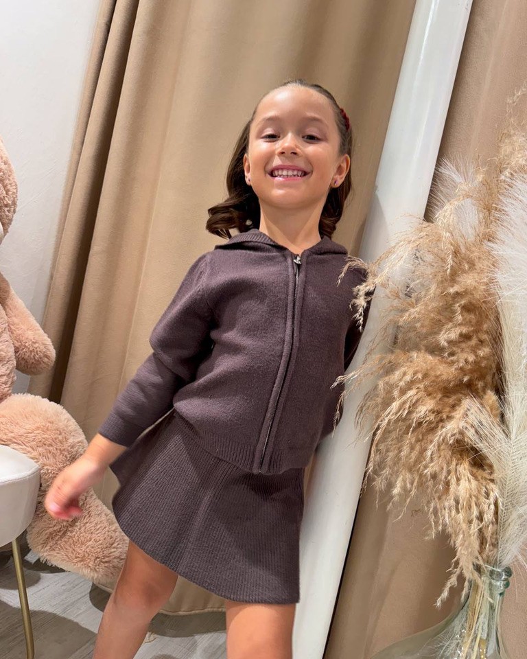 Minigonna in maglia color cioccolato a costine, modello vita medio alta con elastico, svasata sul fondo. Vestibilità regolare ed elasticizzata.