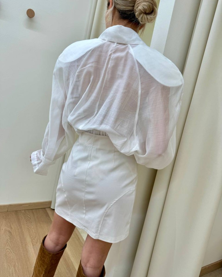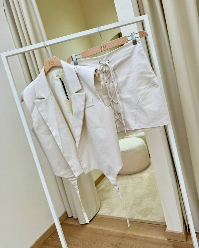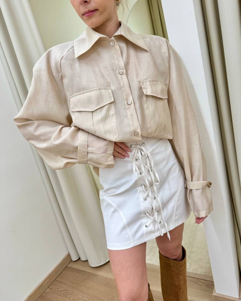 Minigonna color avorio, modello dritto a vita alta con allacciatura davanti tipo corsetto, chiusura laterale con zip invisibile. Vestibilità regolare.