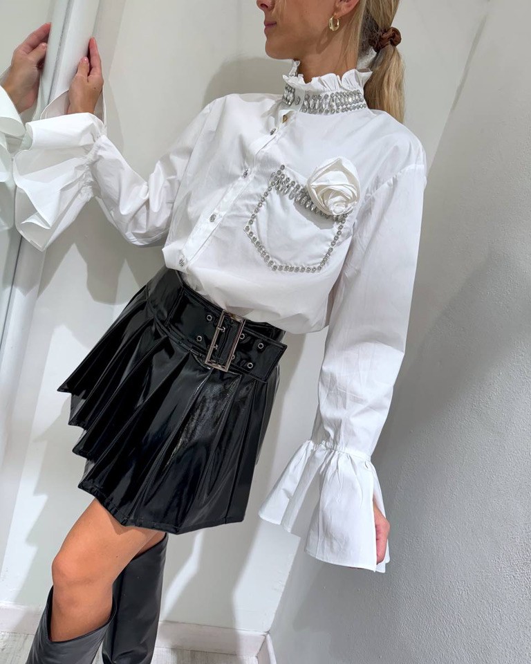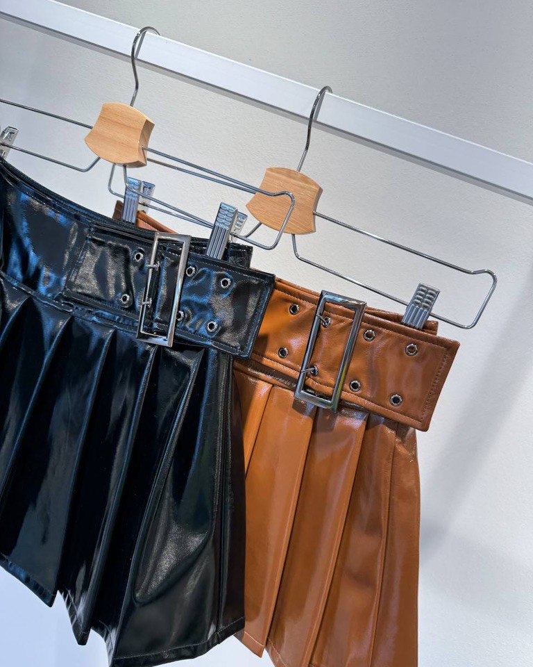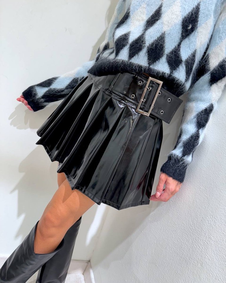 Minigonna “Muccia” in ecopelle lucida nera, modello mini con pieghe e cintura alta in vita regolabile. Chiusura con zip laterale. Vestibilità regolare.