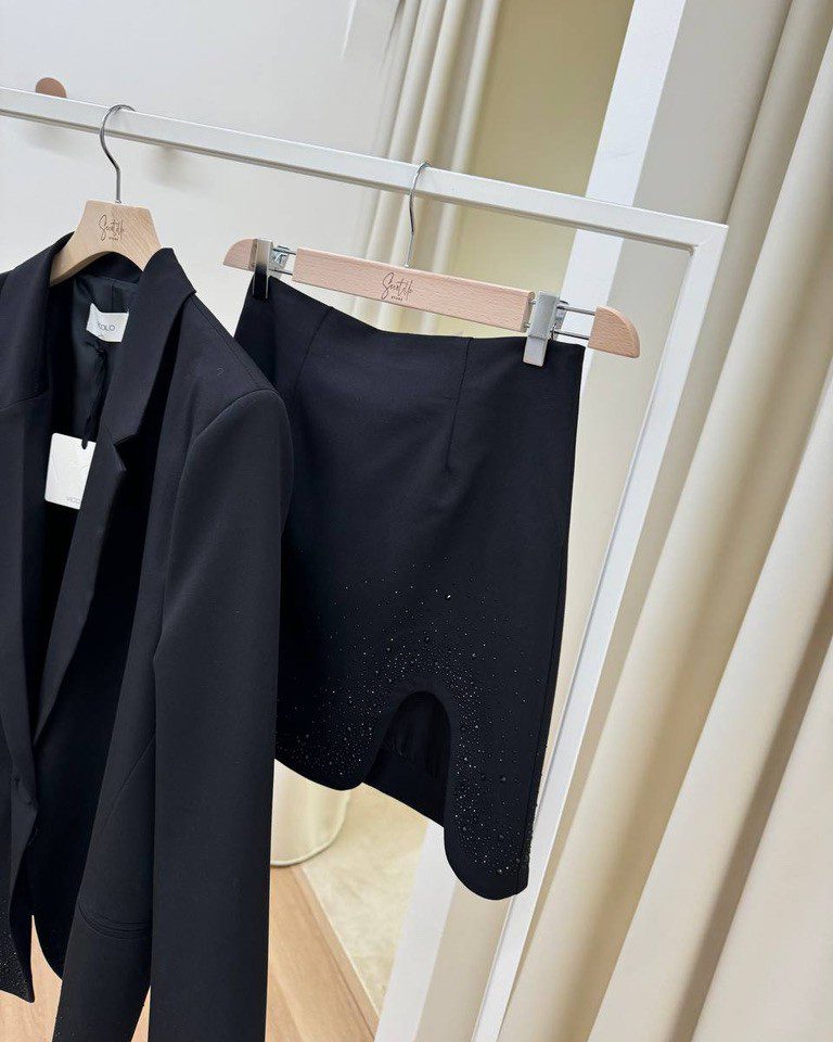 Minigonna nera spacco stondato strass neri sul fondo Vicolo