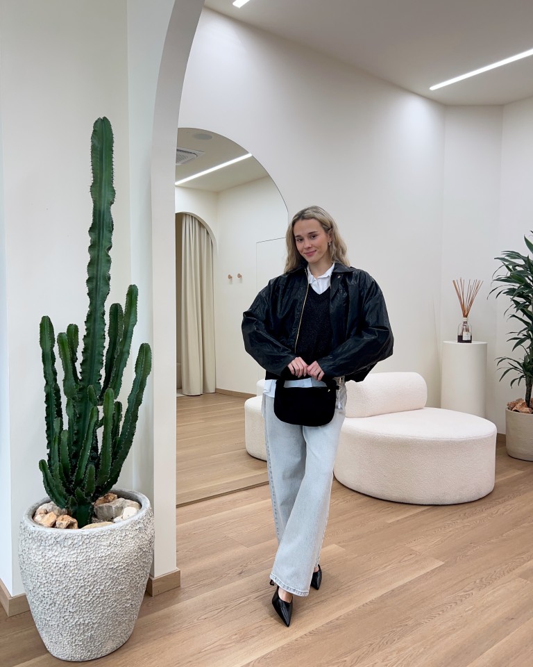 Look dai toni neutri e linee pulite: camicia bianca sotto maglione nero, completati da un bomber in ecopelle nero. I jeans chiari a gamba larga danno equilibrio e leggerezza, mentre décolleté e borsa nere aggiungono un tocco elegante. Casual ma curato, perfetto per la città.