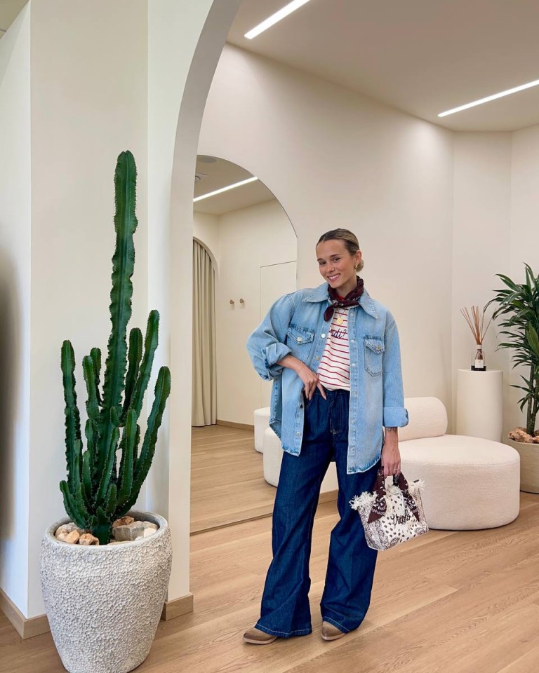 La base è casual ma curata: una t-shirt a righe con scritta, abbinata a jeans a gamba larga che danno movimento e comfort. Sopra, la camicia in denim portata aperta aggiunge un’aria primaverile e disinvolta, perfetta per una giornata all’aperto o una gita fuori porta. Il foulard al collo è il dettaglio che fa la differenza: piccolo ma d’impatto, dà personalità e una vibe un po’ rétro. Gli accessori restano semplici ma studiati: la borsa in tessuto con fantasia bandana richiama il foulard e completa il look con coerenza, mentre le scarpe basse mantengono tutto pratico.