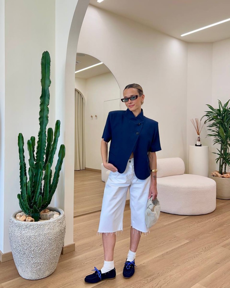 I bermuda in denim bianco spezzano l’eleganza della giacca e aggiungono un contrasto fresco e casual. Il taglio al ginocchio e l’orlo sfrangiato rendono l’insieme meno formale e più rilassato. Gli accessori completano l’outfit donando uno stile contemporaneo.