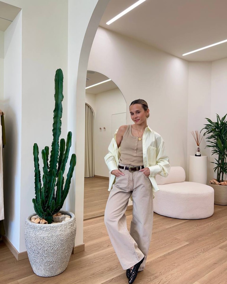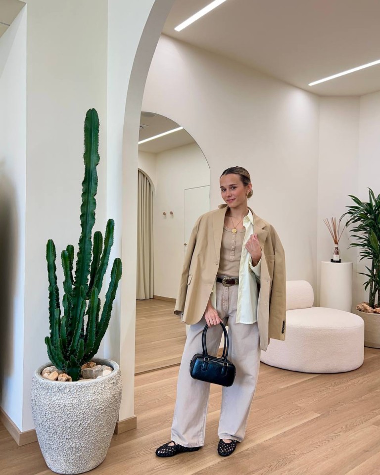 La base è composta da pantaloni ampi color beige chiaro, morbidi e comodi, abbinati ad una canotta neutra tono su tono. Sopra, una camicia chiara lasciata aperta aggiunge un tocco fresco e stratificato. Il blazer oversize color sabbia completa il look, rendendolo più elegante ma senza appesantirlo.