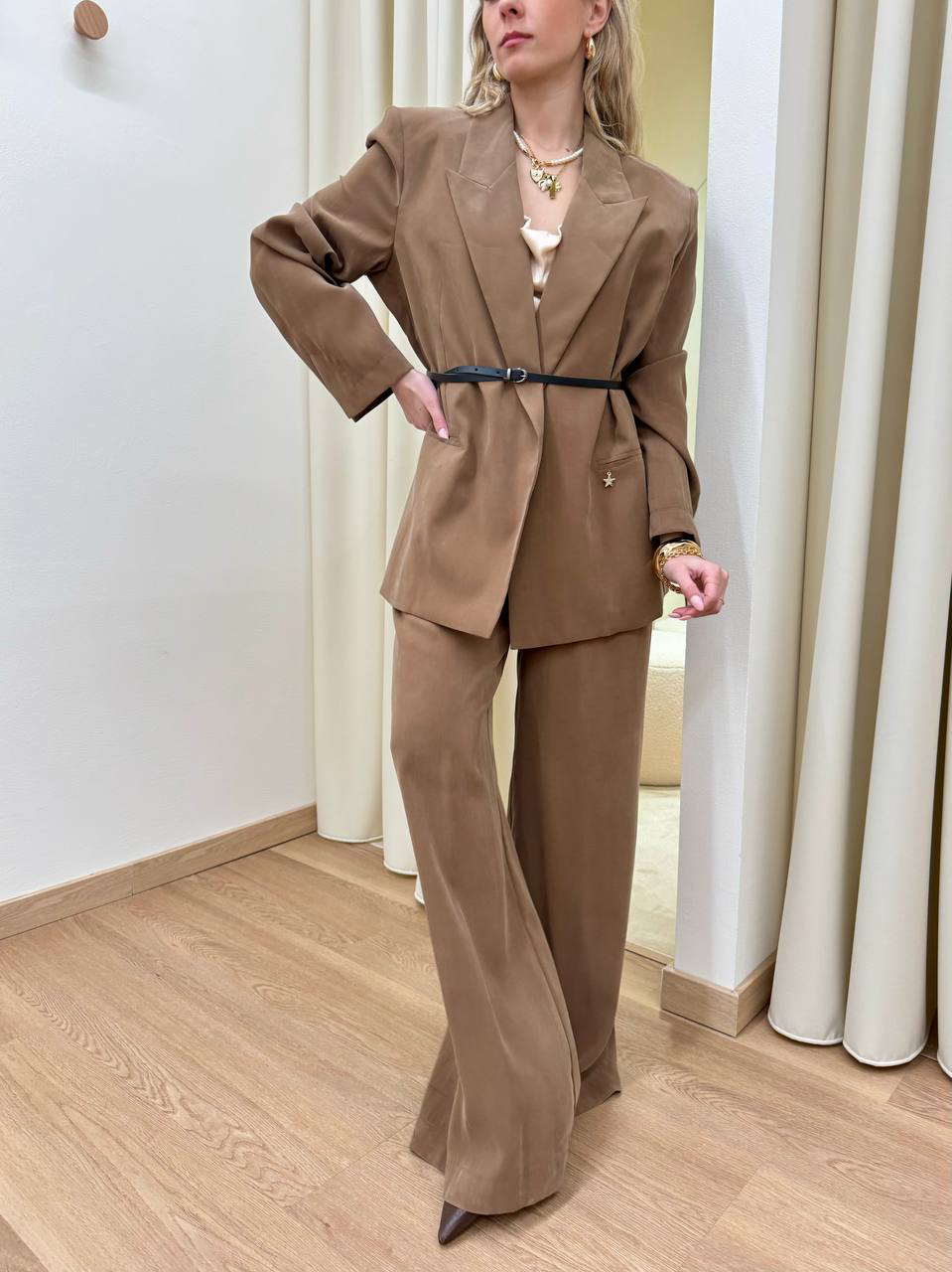 Un completo sartoriale nelle tonalità calde del marrone, elegante e deciso. Il blazer è stretto in vita da una cintura sottile che definisce la silhouette, creando un equilibrio tra struttura e femminilità . Sotto, un top tono su tono mantiene il look armonioso, mentre i pantaloni ampi allungano la figura. Gli accessori neutri, come la borsa beige e le scarpe coordinate, completano un outfit sofisticato e contemporaneo, perfetto per una cerimonia serale non convenzionale.