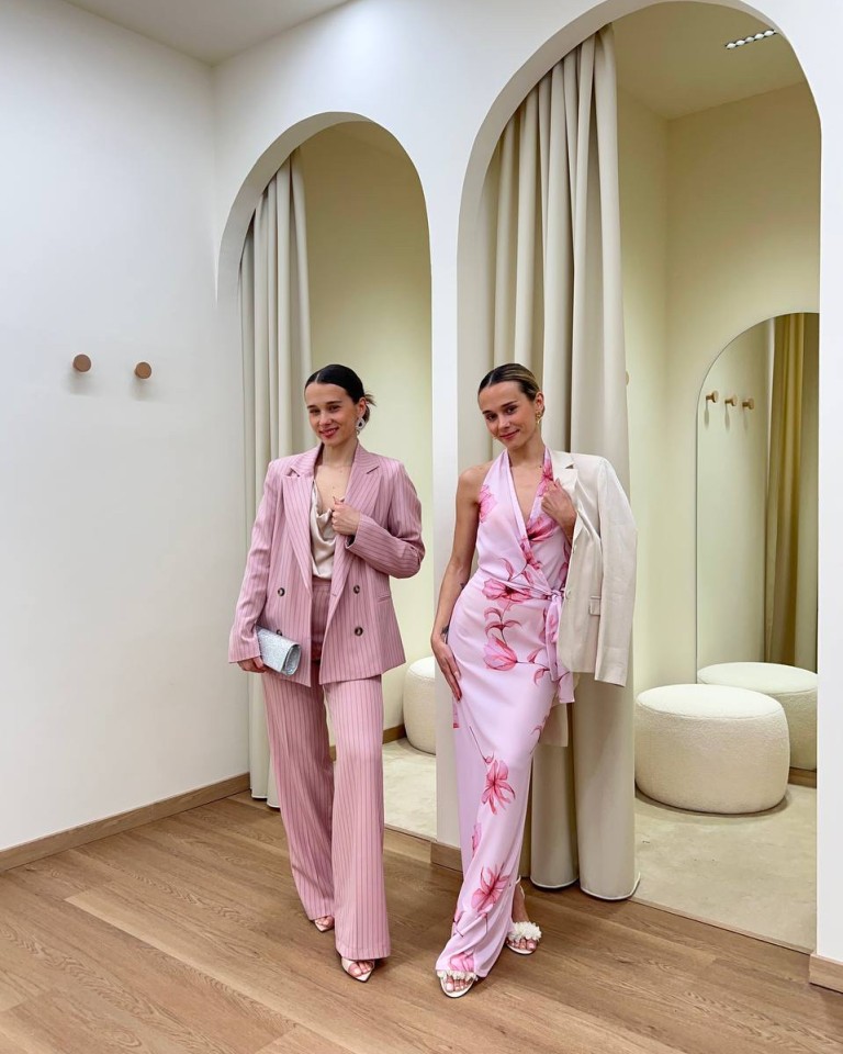 Un completo tailleur rosa cipria a righe sottili, dal taglio morbido ma strutturato. La giacca doppiopetto dona un’aria raffinata e contemporanea, abbinata a un top satinato color avorio che aggiunge luce e delicatezza. I pantaloni palazzo slanciano la figura e rendono l’outfit fluido ed elegante. Completano il look una clutch argentata e sandali minimal, per un effetto chic e sofisticato, perfetto per una cerimonia moderna.