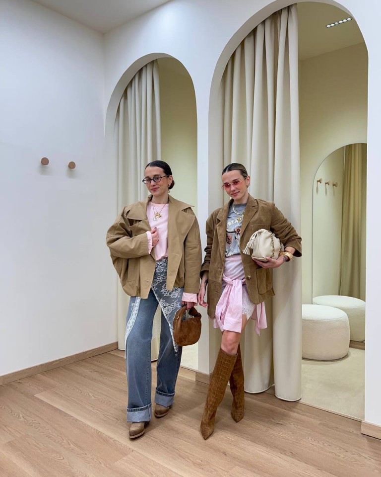L’outfit è composto da una maglia rosa chiaro dalla vestibilità morbida con maniche ampie, che crea un effetto delicato e romantico, abbinata a un jeans wide-leg grigio chiaro dona un tocco casual e contemporaneo. Annodato in vita c’è un pareo in pizzo bianco, che aggiunge texture e un contrasto femminile molto interessante, glibstivaletti sabbia con tacco medio completano il look con una nota calda e versatile.