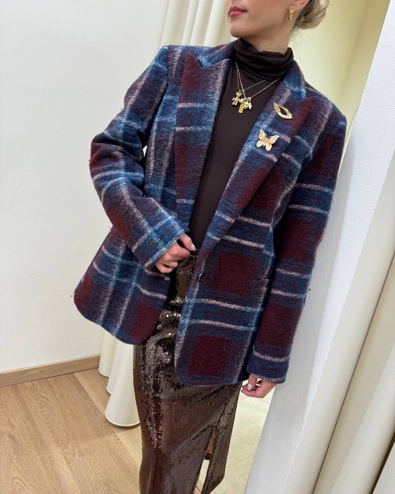 Un look che unisce classicità e brillantezza. Il blazer a quadri nei toni del blu e bordeaux con dettagli gioiello sul rever avvolge con eleganza, abbinato a un dolcevita moro che slancia la figura. La protagonista è la gonna midi in paillettes, sempre sui toni del marrone, luminosa ma sofisticata, perfetta per catturare la luce senza eccessi. Gli stivaletti a punta bordeaux e la clutch coordinata completano l’insieme con carattere e femminilità.
