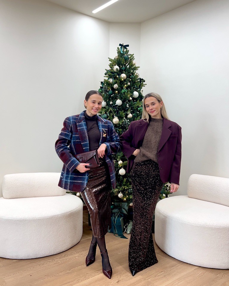 Questo outfit richiama il calore delle festività grazie ai colori profondi e ai tessuti avvolgenti, mentre le paillettes aggiungono quel tocco scintillante ideale per cene natalizie, aperitivi eleganti e incontri speciali.