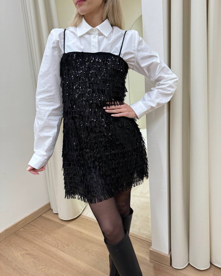 Un look natalizio sofisticato e deciso, pensato per brillare durante le feste. L’outfit combina una camicia bianca sartoriale con colletto gioiello a una mini dress nero ricoperto di frange fatte di micro paillettes, che catturano la luce ad ogni movimento. La cravatta gioiello nera aggiunge un tocco androgino e contemporaneo, mentre i boots al ginocchio in pelle nera slanciano la silhouette con eleganza.