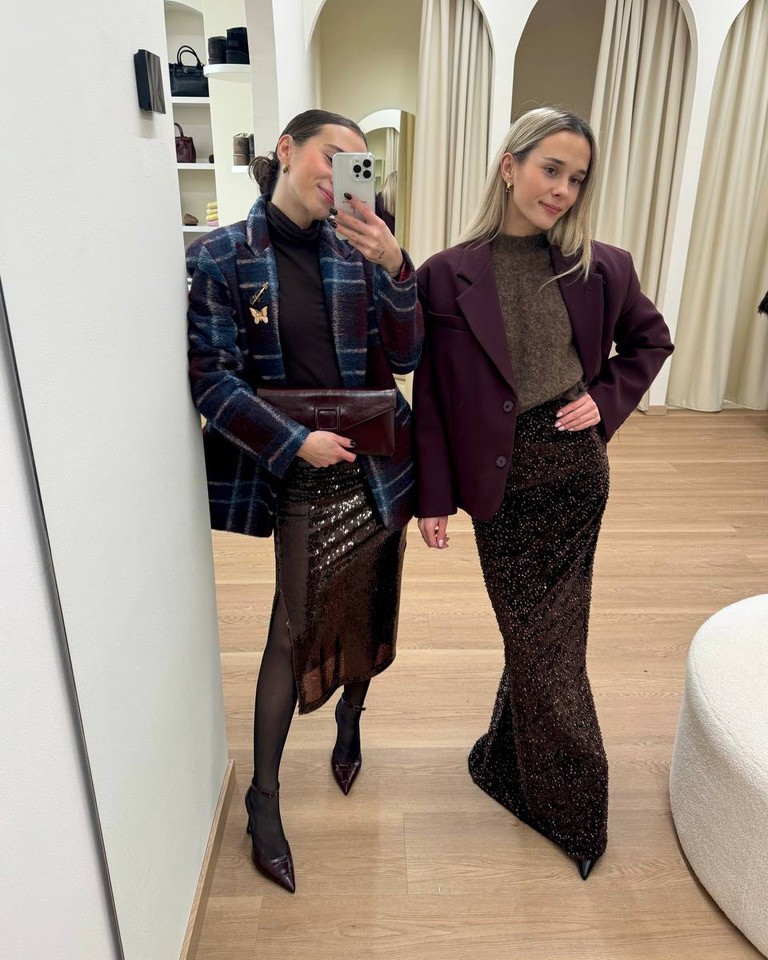 Un’eleganza pulita e contemporanea. Il blazer color prugna, strutturato ma morbido, si abbina a un maglione dai toni caldi e naturali. La gonna lunga in velluto moro e paillettes scure dona movimento e luce con discrezione, creando un contrasto raffinato con le linee essenziali del resto del look. Le décolleté a punta aggiungono slancio e un’allure decisamente sofisticata.