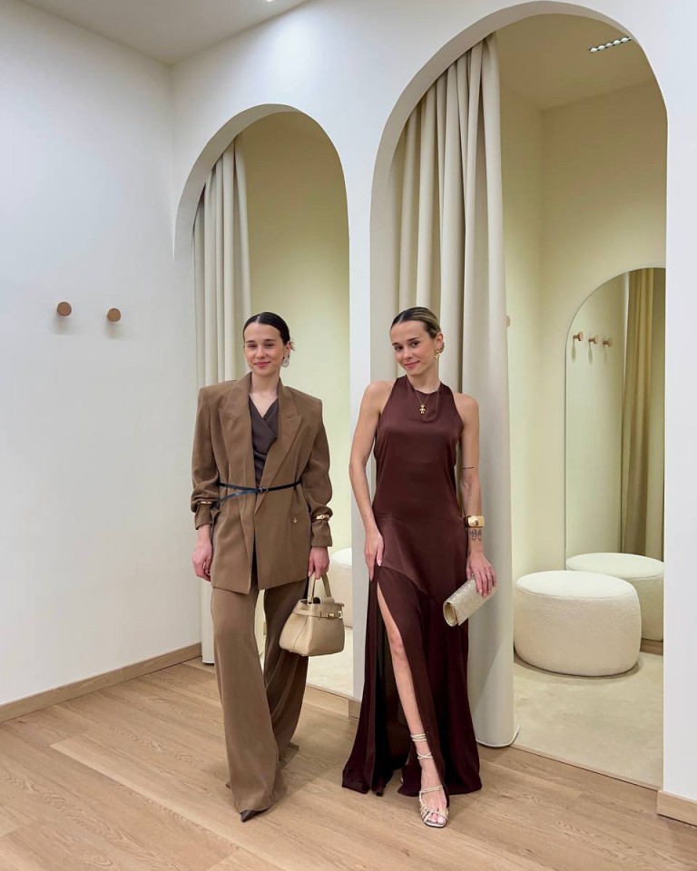 Un abito lungo in satin color cioccolato, fluido e luminoso, che scivola sul corpo con eleganza. Il taglio essenziale è reso più audace dallo spacco profondo, che dona movimento e slancio alla figura. Il design senza maniche e la linea pulita esaltano la semplicità raffinata del capo. Gli accessori dorati e la clutch brillante aggiungono luce, rendendo il look sofisticato, femminile e perfetto per una cerimonia serale chic.