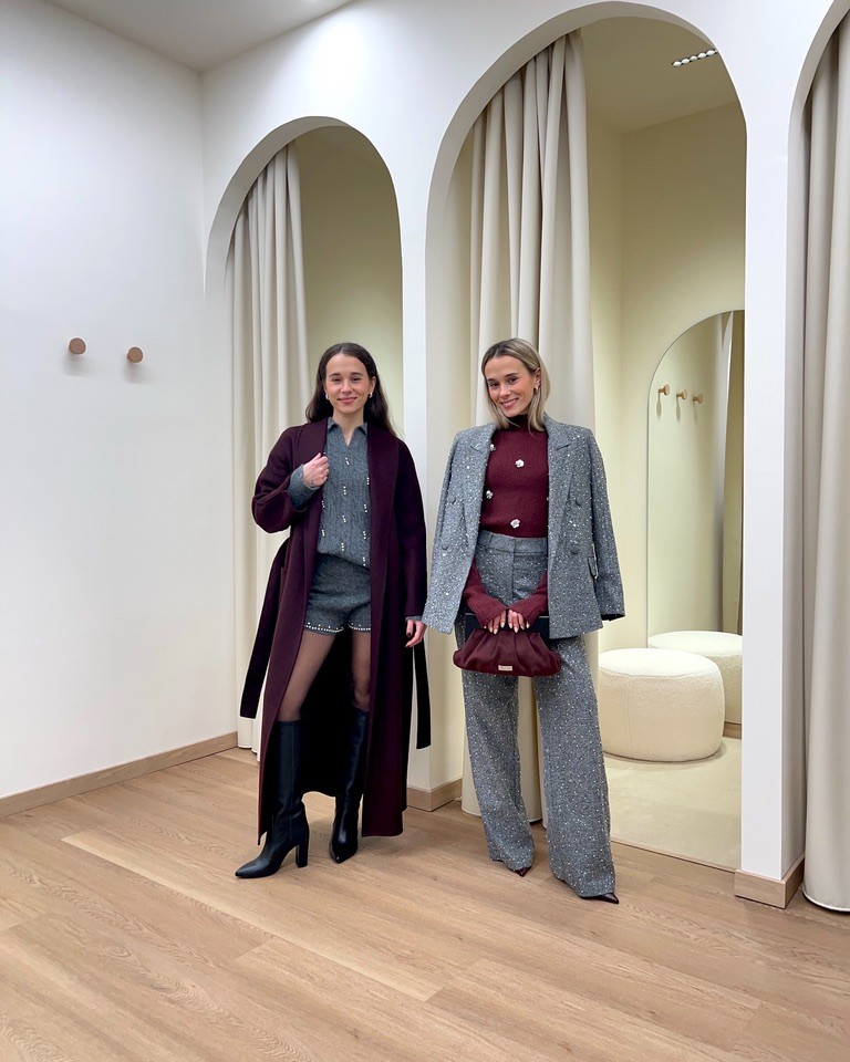 Un completo sofisticato che unisce un blazer grigio ricoperto da perline e micro paillettes ad un pantalone coordinato a gamba larga, creando un effetto luminoso e ricercato. Il tocco di colore è dato dal maglioncino bordeaux a collo alto con manicotti, impreziosito da applicazioni di piccoli fiori di paillettes. La pochette e la decolletè riprendono la tonalità della maglia completando il look in modo armonioso.