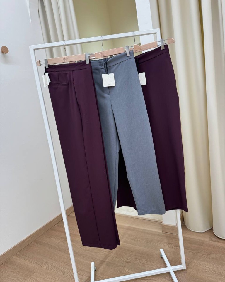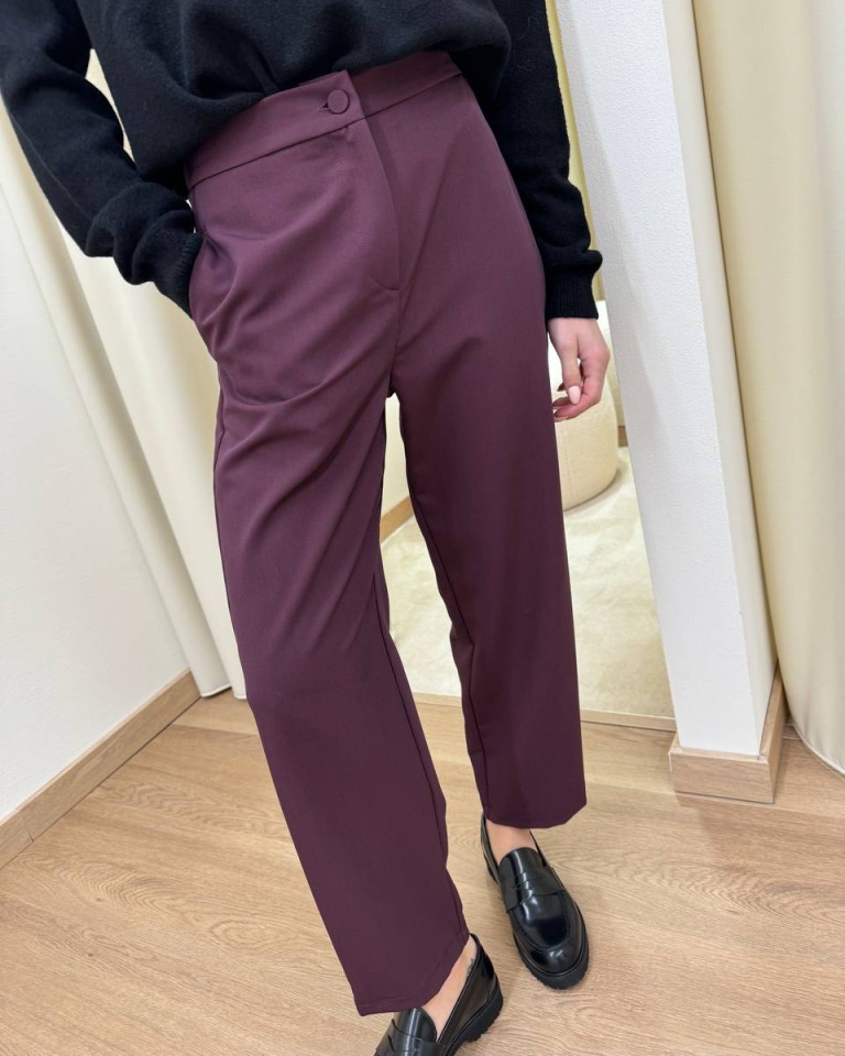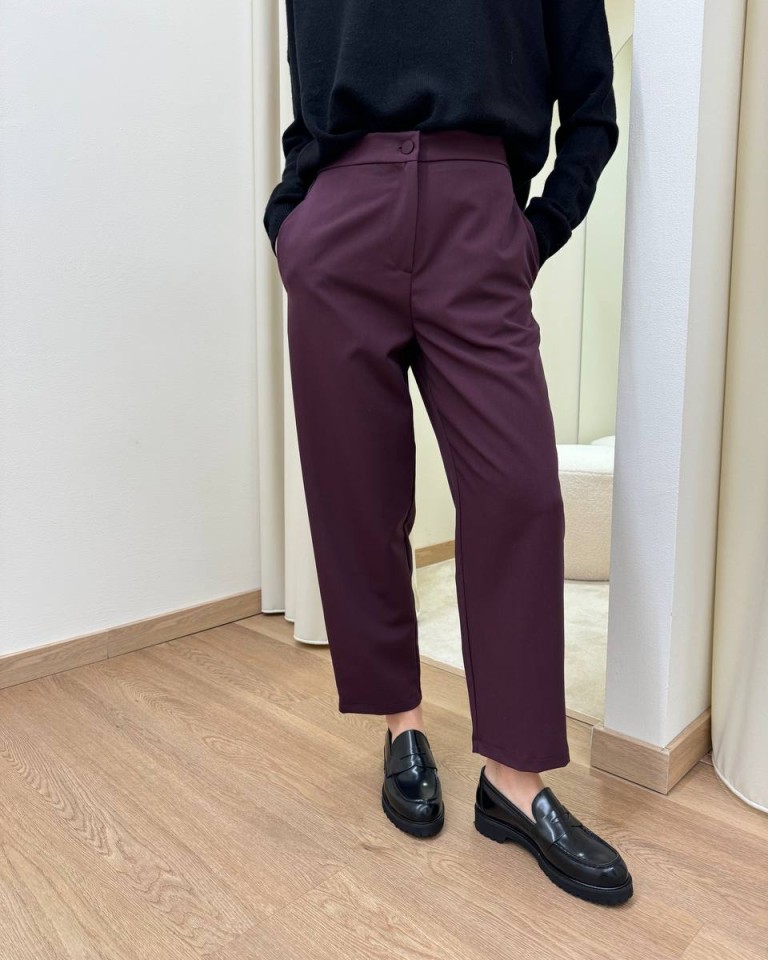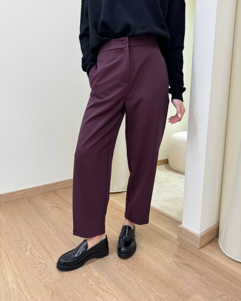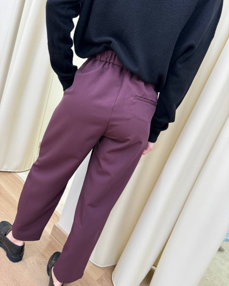 Pantalone bordeaux con viscosa, modello sigaretta con tasche al fianco, una tasca a filetto dietro, vita alta con elastico sul dietro. Chiusura frontale con zip e bottone. Vestibilità regolare.