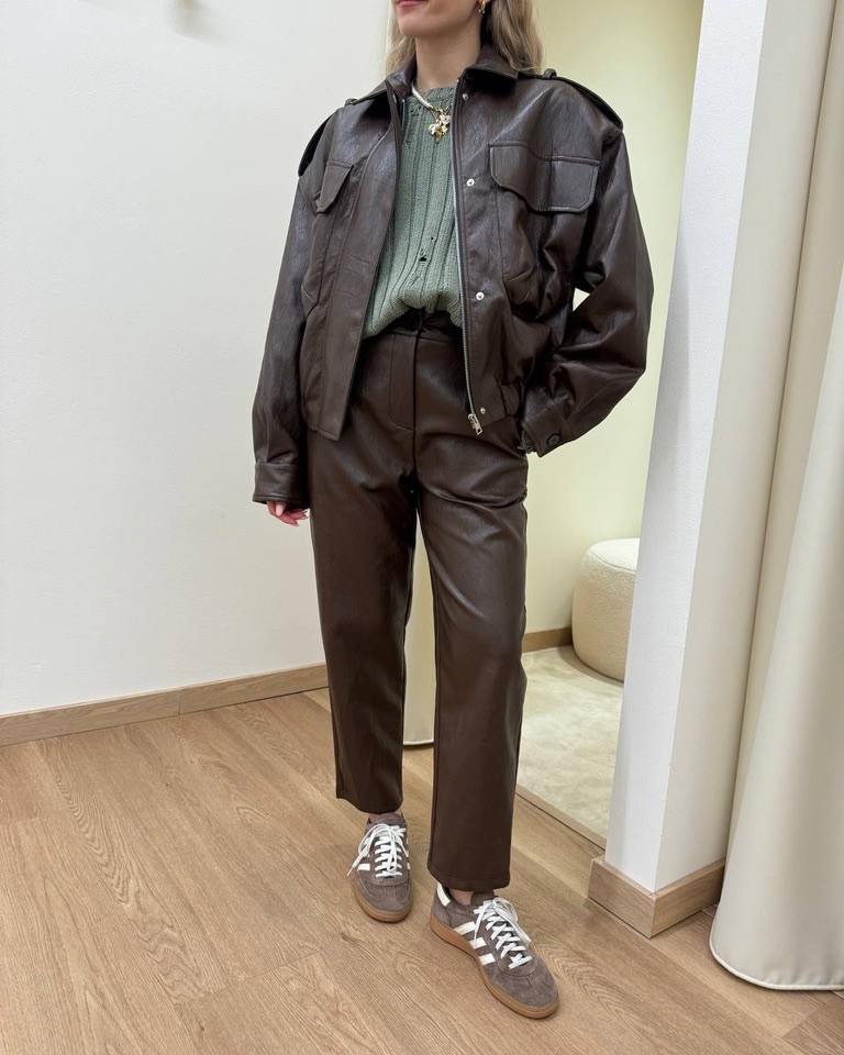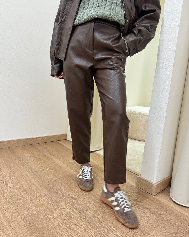 Pantalone in ecopelle moro. Modello a sigaretta con una tasca a filetto sul dietro e tasche laterali, vita alta con elastico dietro. Chiusura davanti con zip e bottone. Vestibilità regolare.