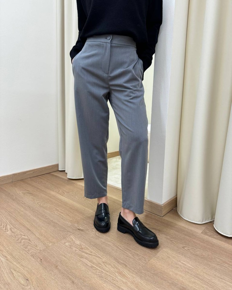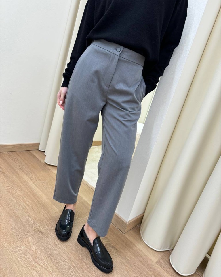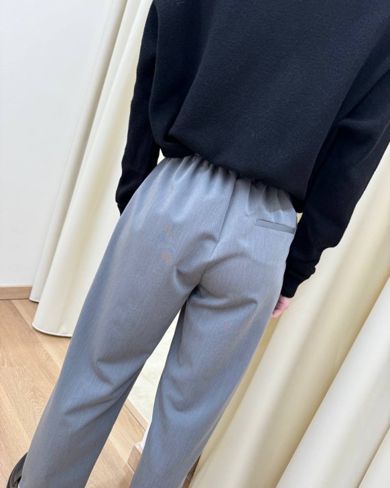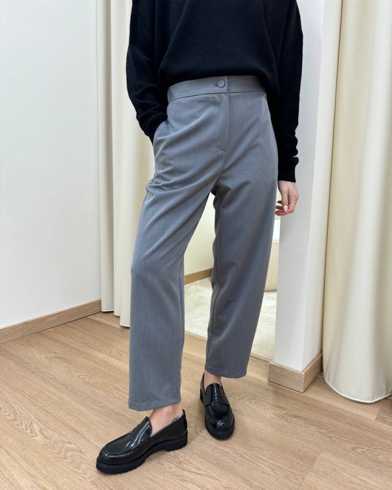 Pantalone grigio con viscosa, modello sigaretta con tasche al fianco, una tasca a filetto dietro, vita alta con elastico sul dietro. Chiusura frontale con zip e bottone. Vestibilità regolare.
