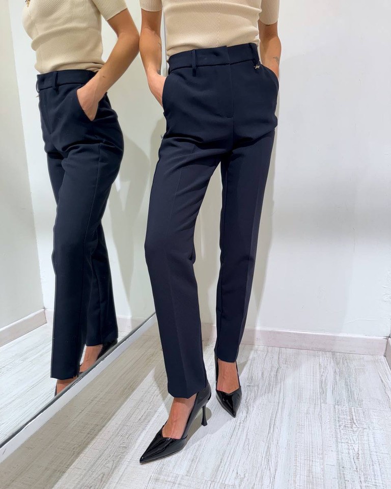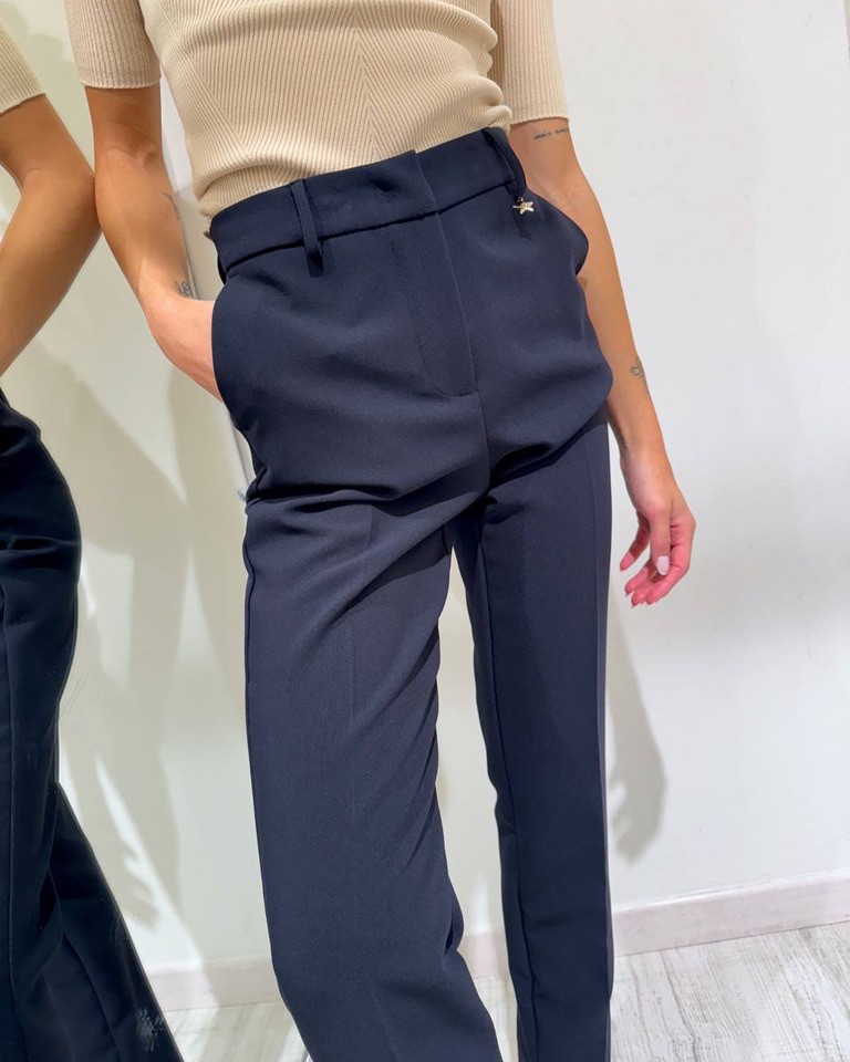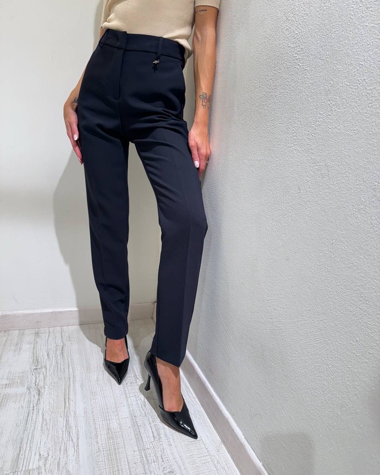 Pantalone blu modello sigaretta con vita medio alta con passanti, tasche laterali a filo e chiusura frontale con cerniera e gancio nascosti. Vestibilità regolare non elasticizzata.