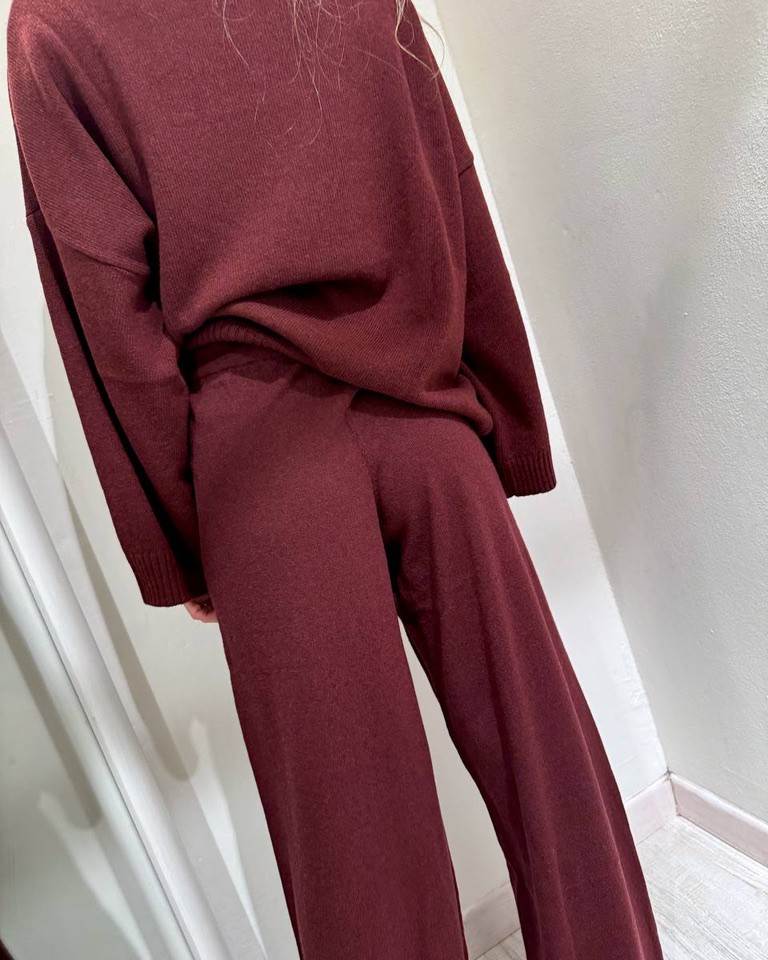 Pantalone in maglia color bordeaux in viscosa, lana e cachemire, modello dritto e morbido e vita alta con fascia elastica. Vestibilità regolare.