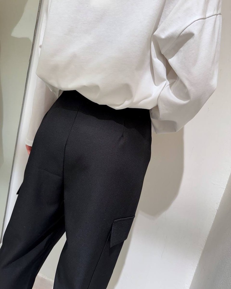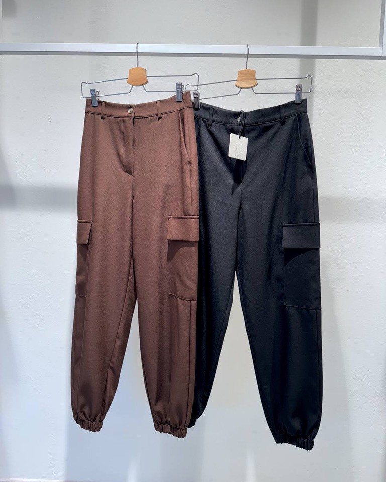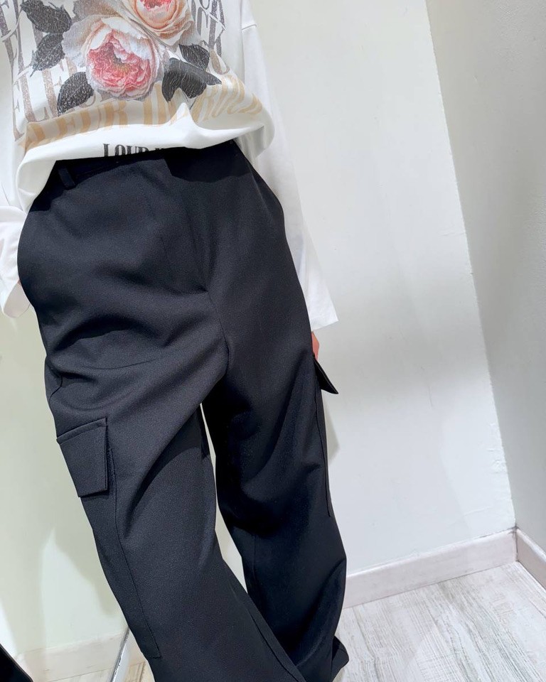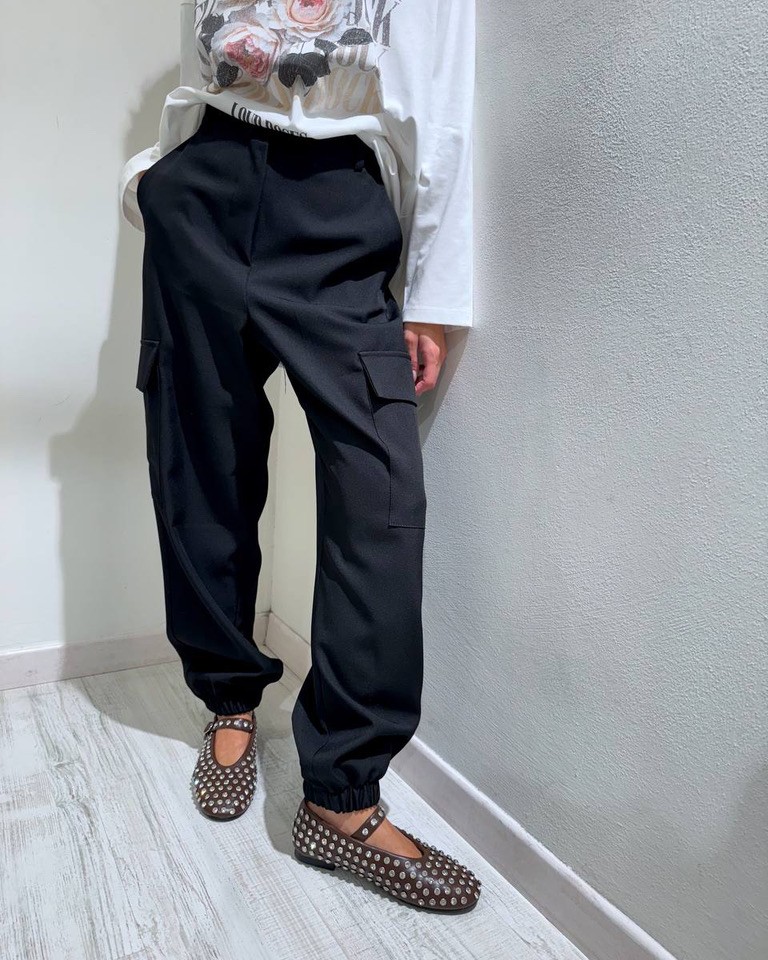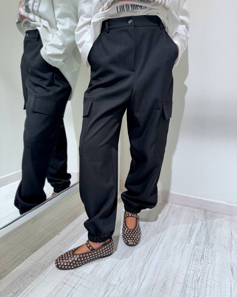 Pantalone nero modello cargo, con elastico sul fondo, maxi tasche laterali, vita medio alta e chiusura frontale con zip e bottone. Tasche laterali. Vestibilità rmorbida.