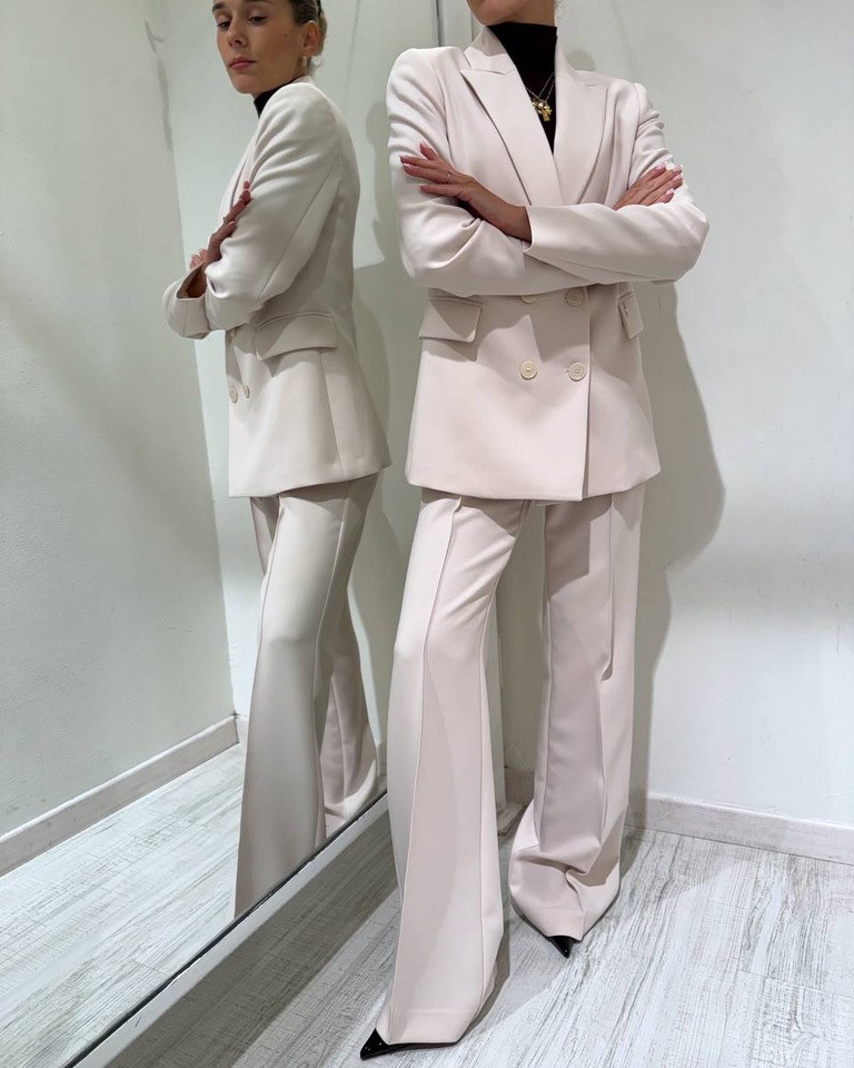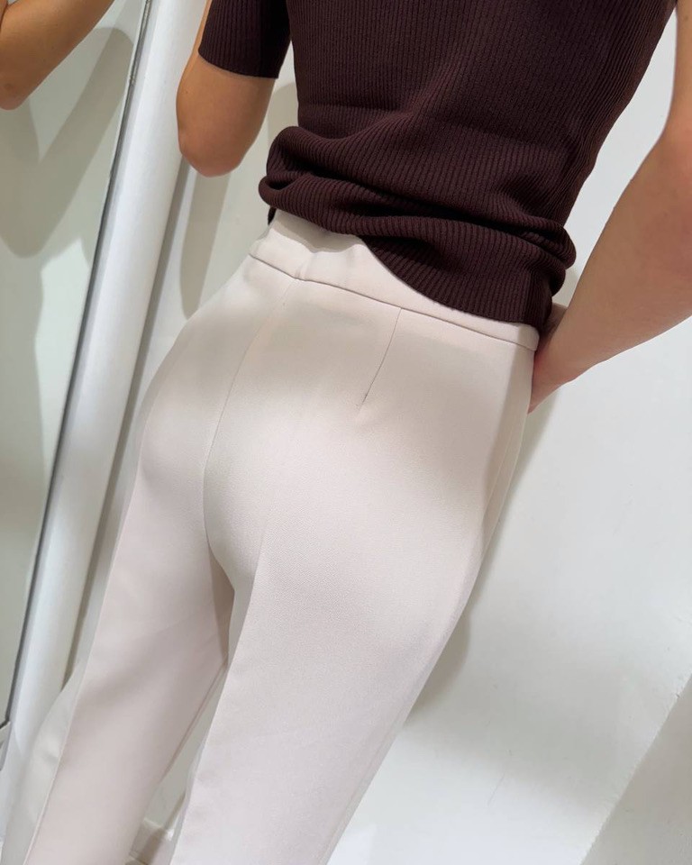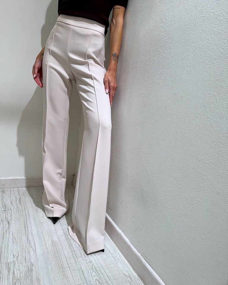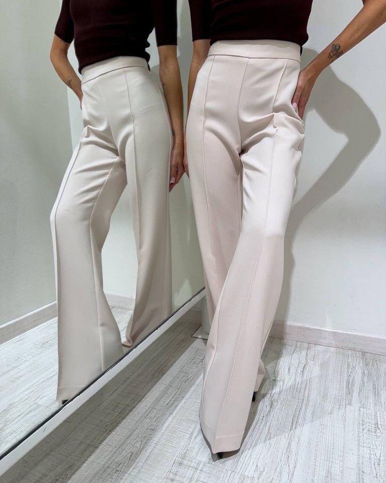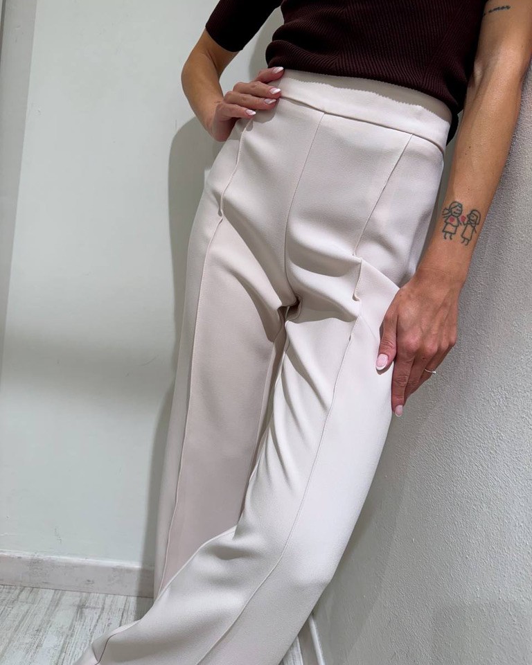 Pantalone crema modello palazzo con dettaglio cucitura in rilievo, vita alta con chiusura laterale con cerniera invisibile. Vestibilità regolare non elasticizzata.