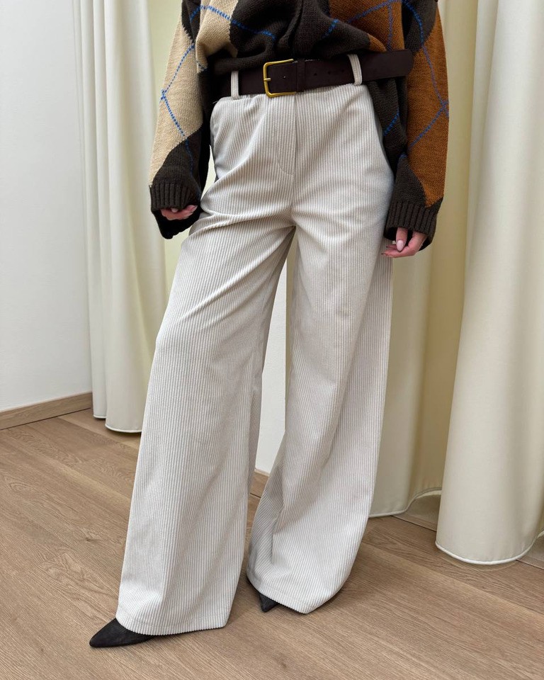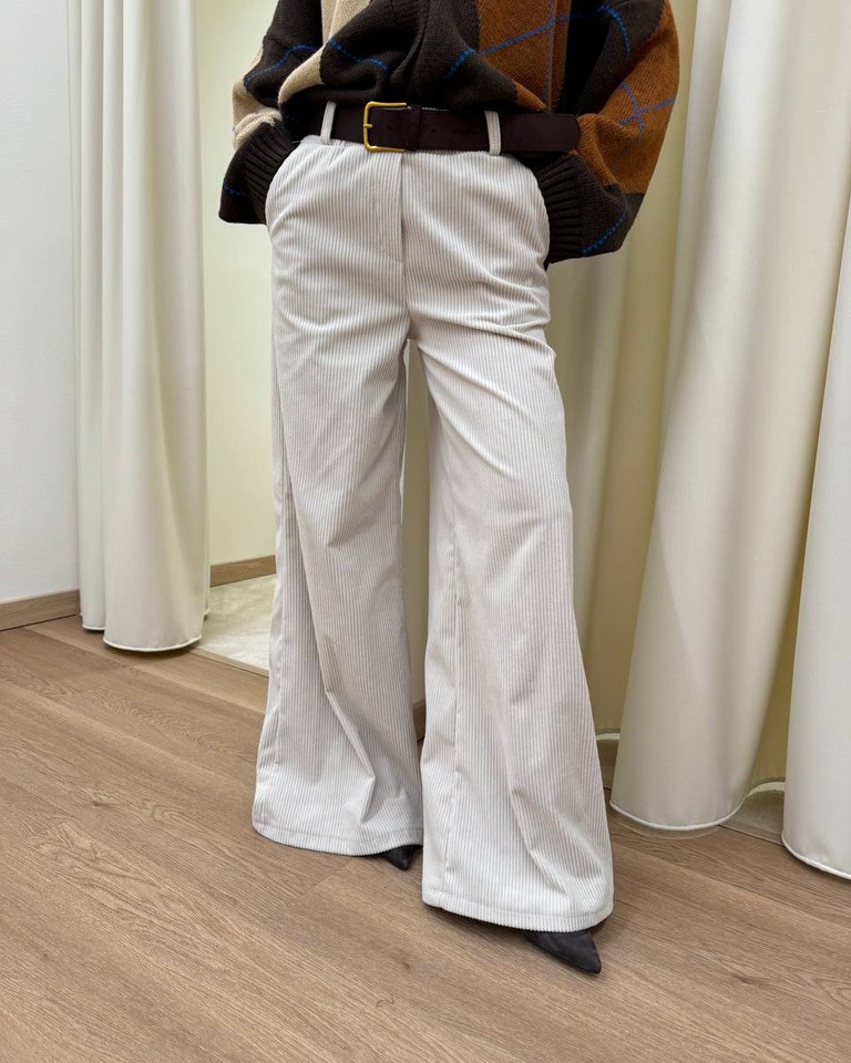 Pantalone in velluto rocciatore color burro, modello palazzo con vita medio alta con elastico, tasche laterali e cintura abbinata in velluto. Vestibilità regolare.