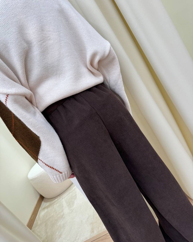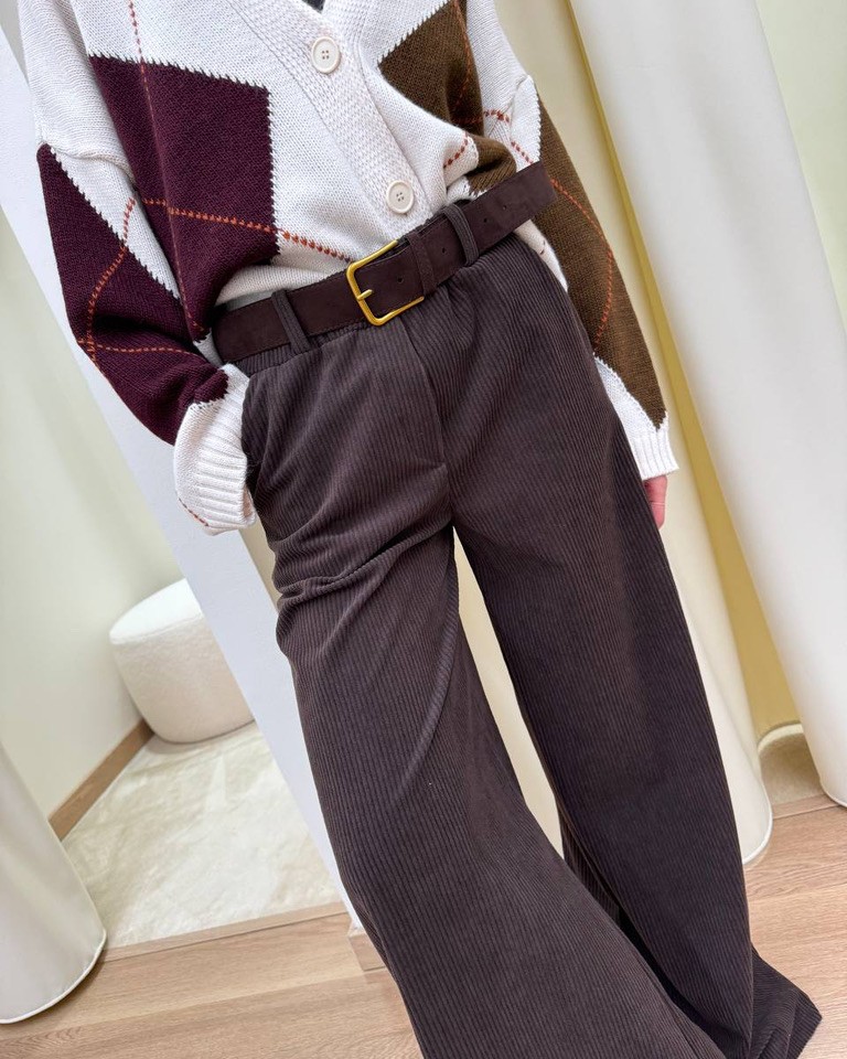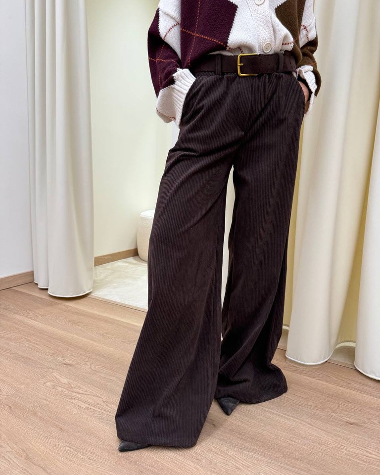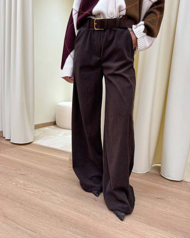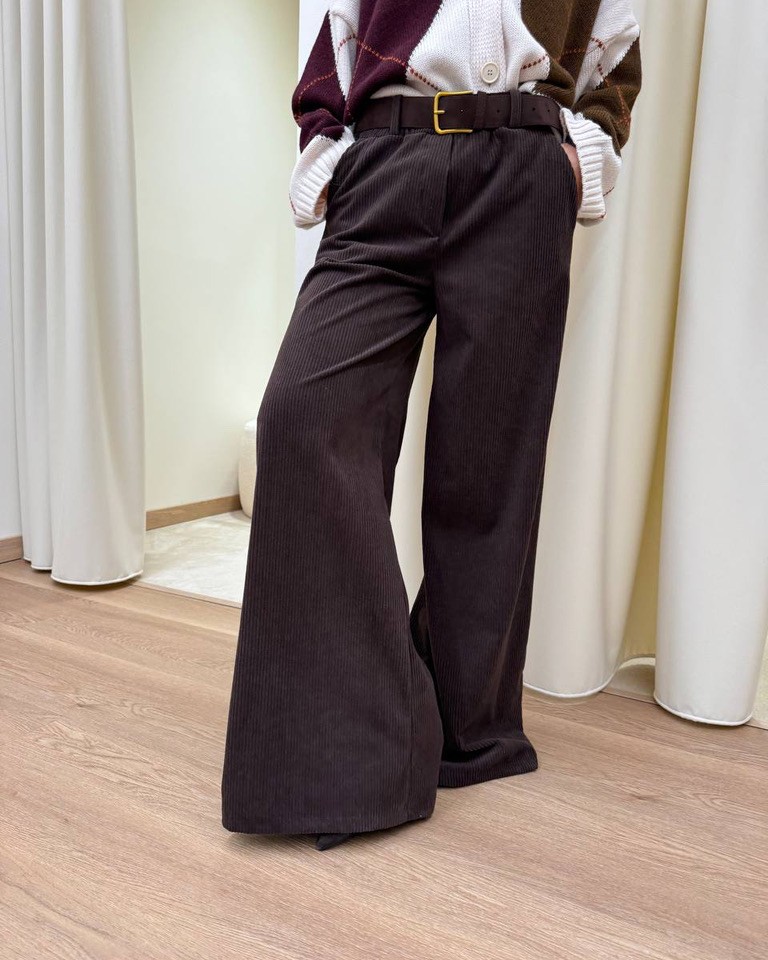 Pantalone in velluto rocciatore color moro, modello palazzo con vita medio alta con elastico, tasche laterali e cintura abbinata in velluto. Vestibilità regolare.