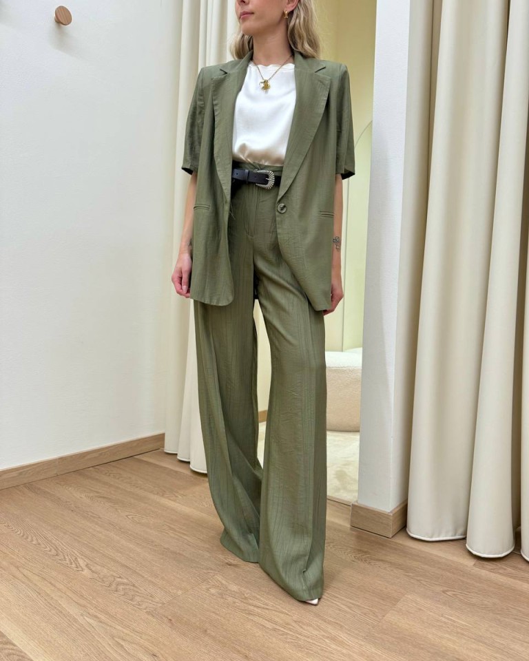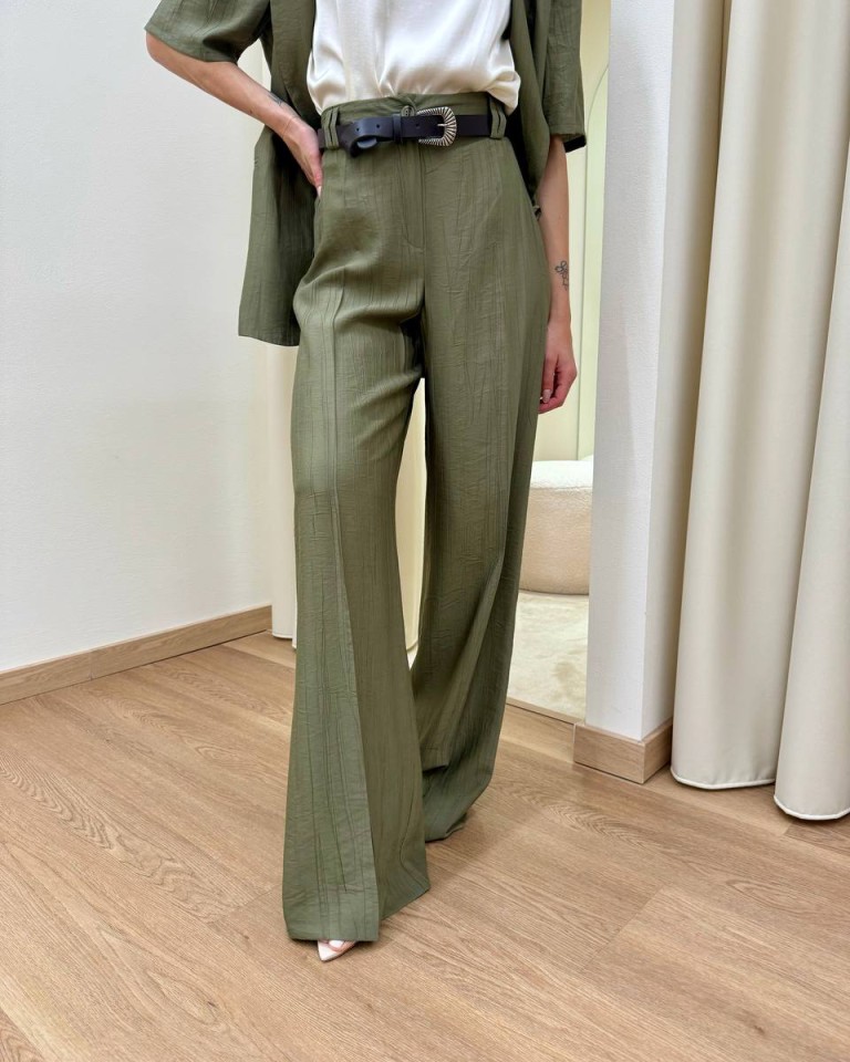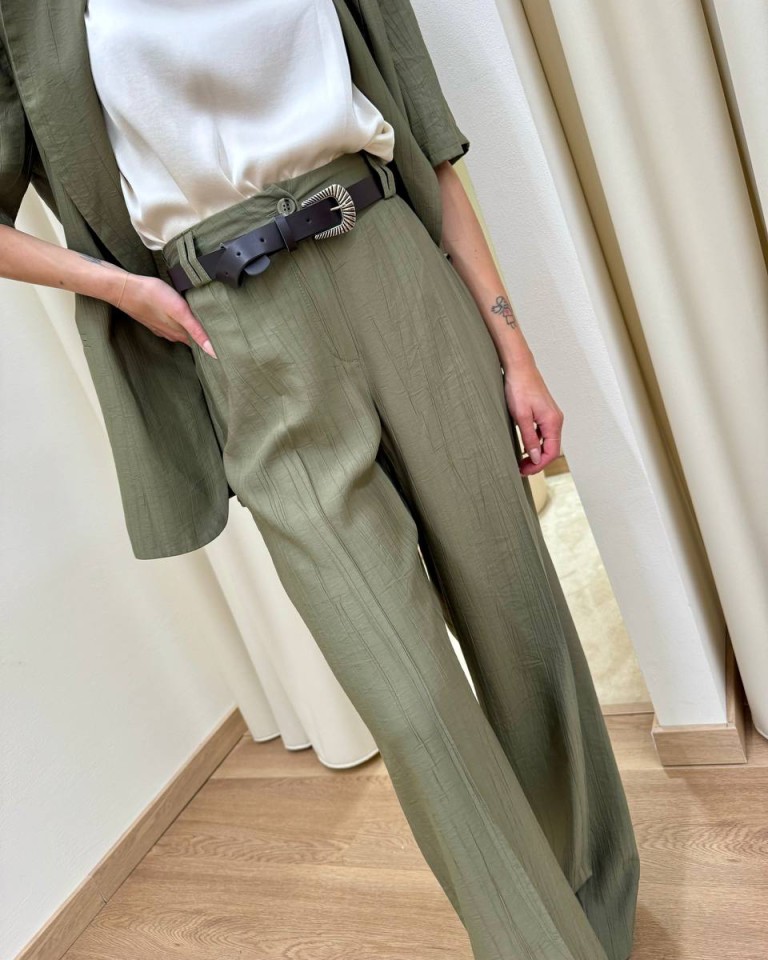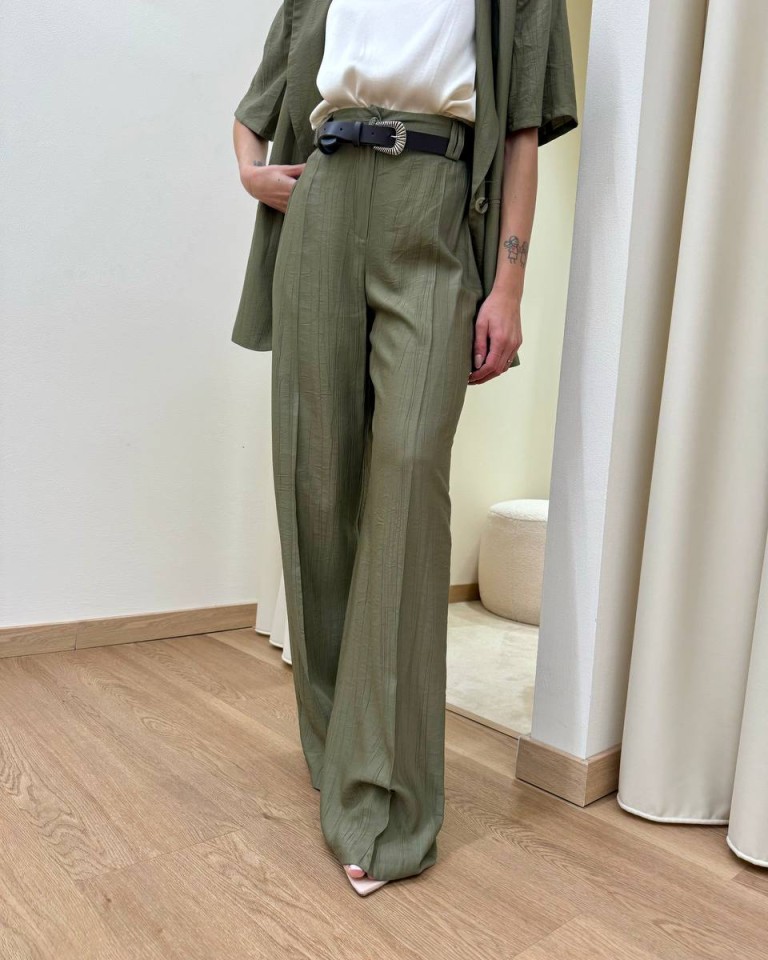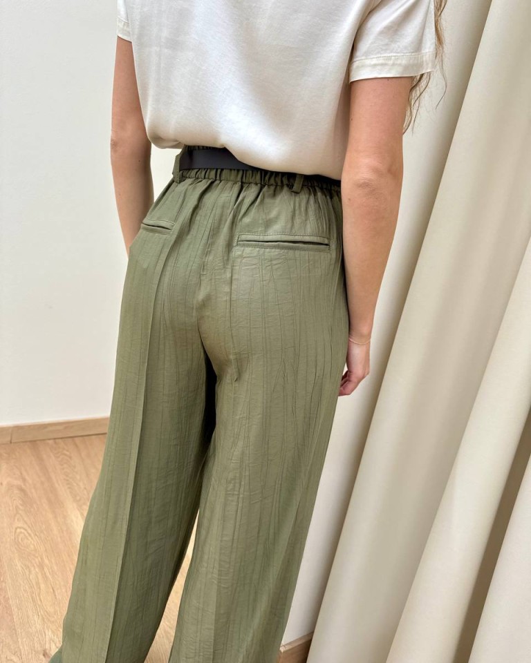 Pantalone effetto stropicciato color verde salvia, modello a gamba dritta a vita alta con elastico e cintura abbinata, tasche dietro a filetto, chiusura davanti con zip. Vestibilità regolare.