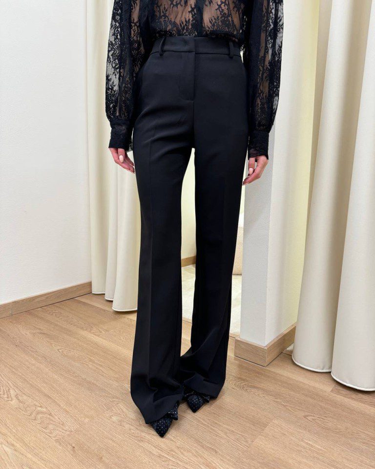 Pantalone nero, modello gamba a zampa, vita medio alta con chiusura zip e bottone interno. Tasche laterali a filo. Vestibilità regolare.