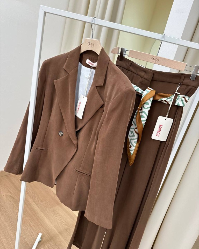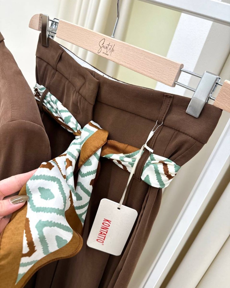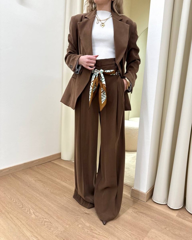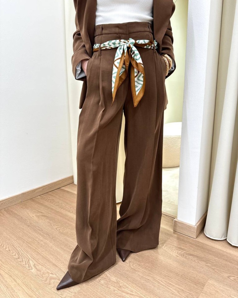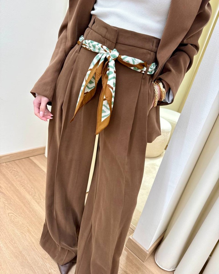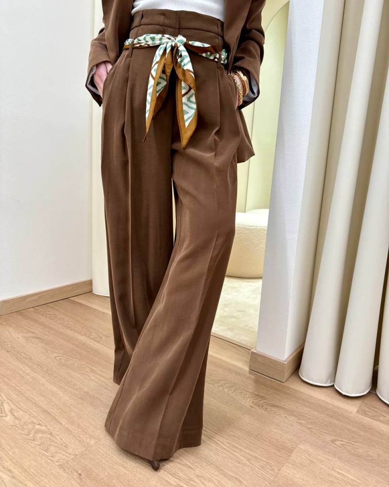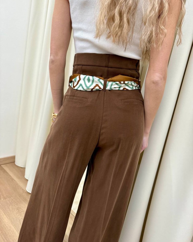 Pantalone color cioccolato in tessuto morbido, modello fluido a palazzo, vita alta con pinces, doppi passanti e foulard abbinato, tasche laterali e tasche dietro a filetto, chiusura davanti con zip e gancio. Vestibilità regolare.