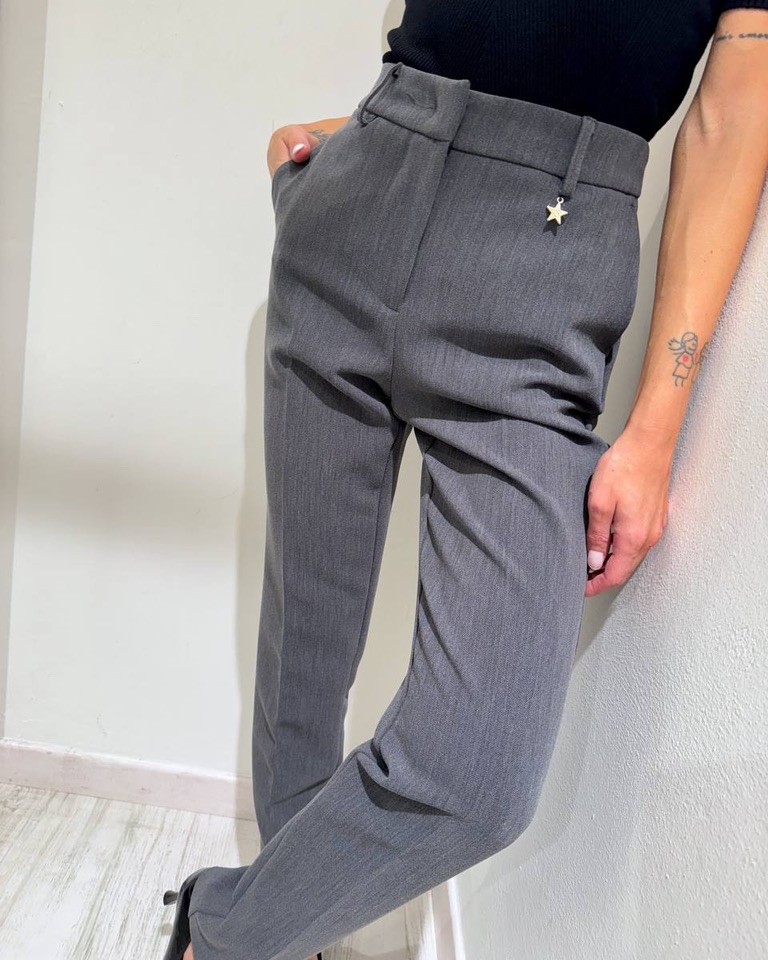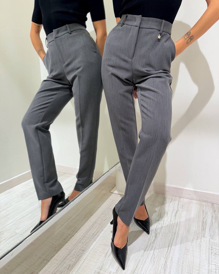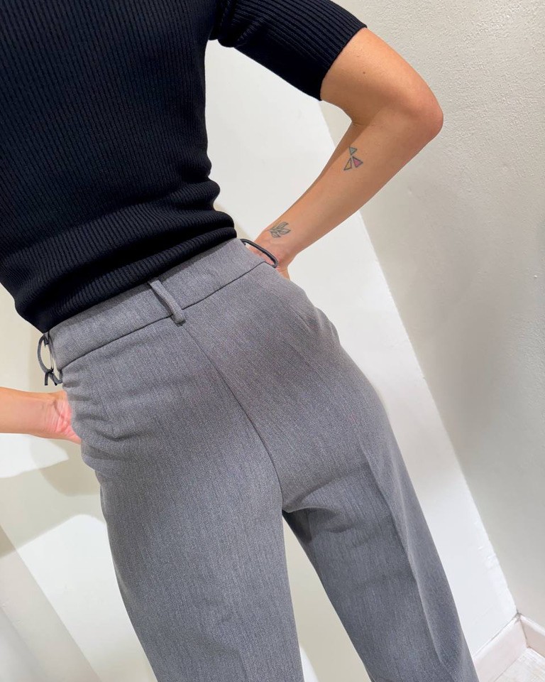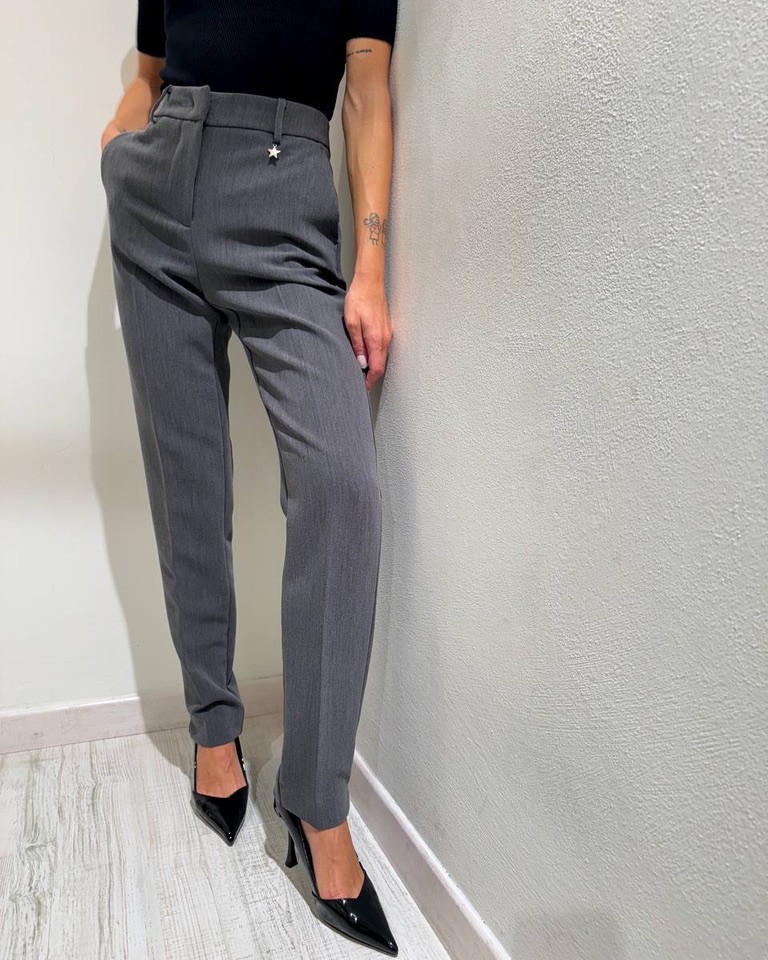 Pantalone grigio modello sigaretta con vita medio alta con passanti, tasche laterali a filo e chiusura frontale con cerniera e gancio nascosti. Vestibilità regolare non elasticizzata.