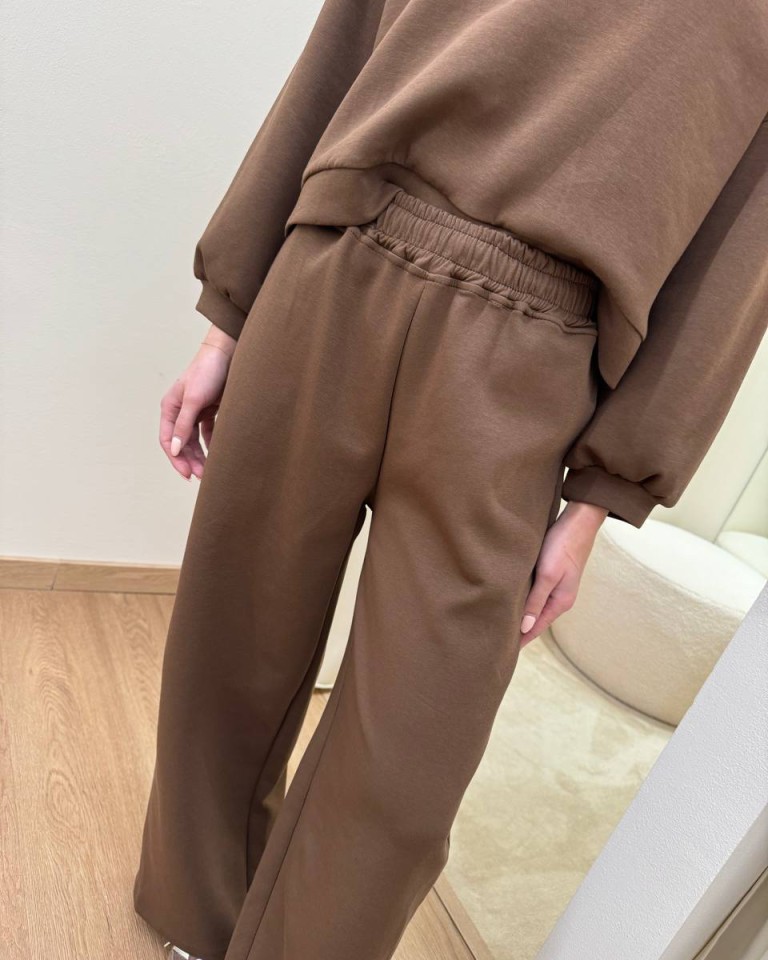 Pantalone in felpa color cioccolato, modello palazzo vita alta con elastico e laccio regolabile interno, tasche laterali. Vestibilità morbida e regolare.