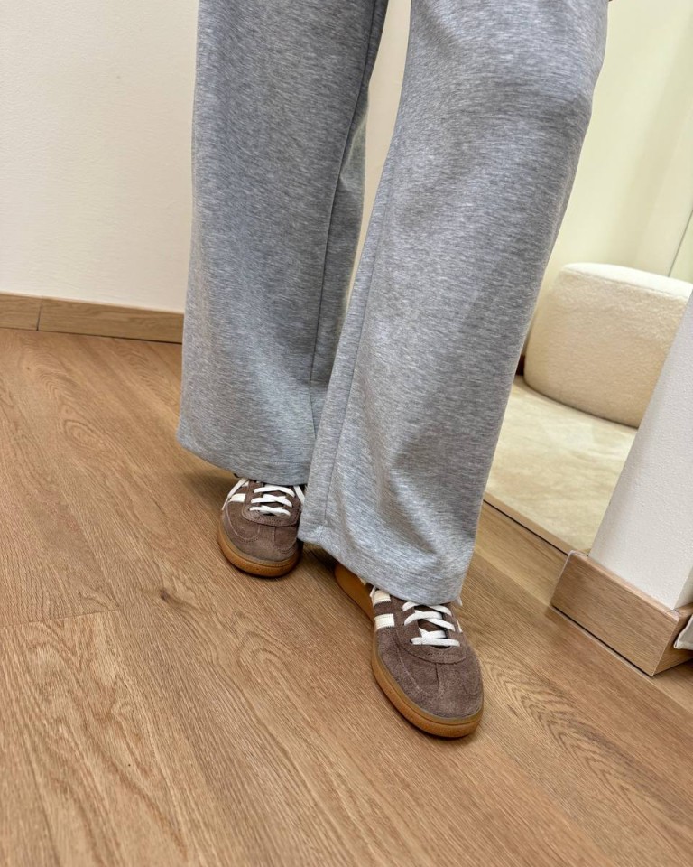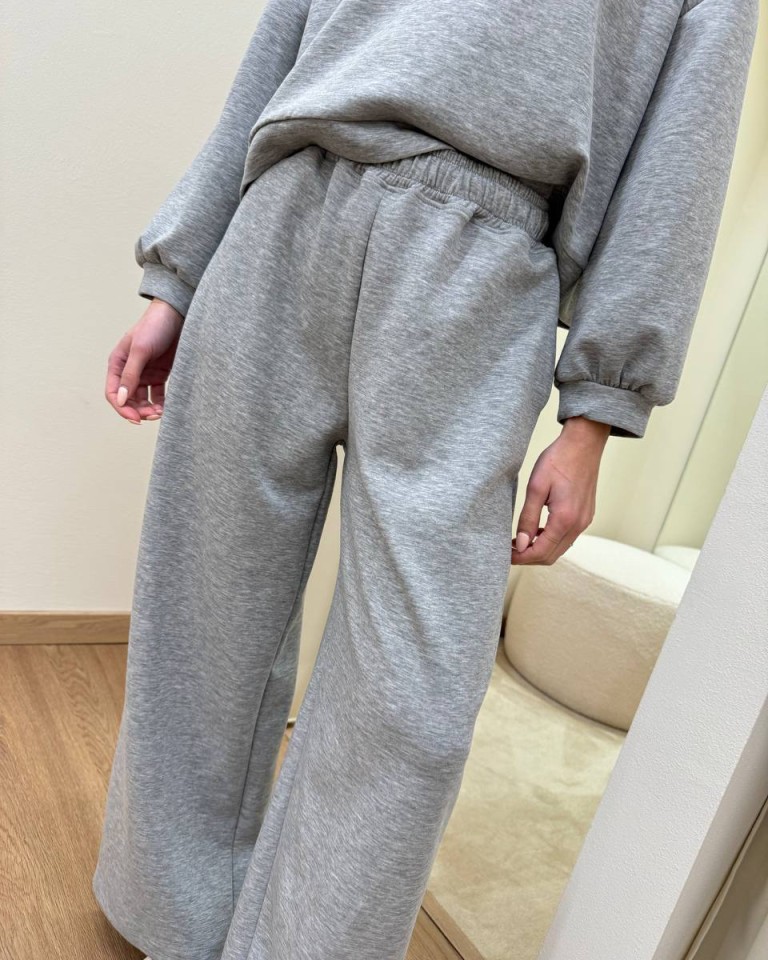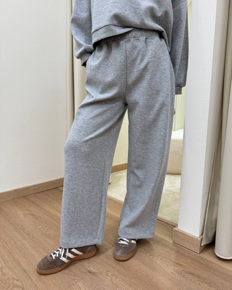 Pantalone in felpa color grigio melange, modello palazzo vita alta con elastico e laccio regolabile interno, tasche laterali. Vestibilità morbida e regolare.