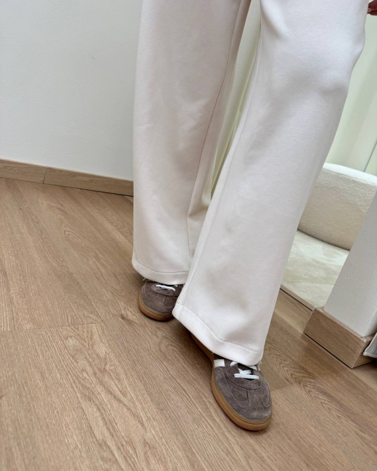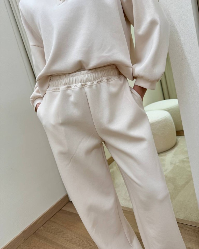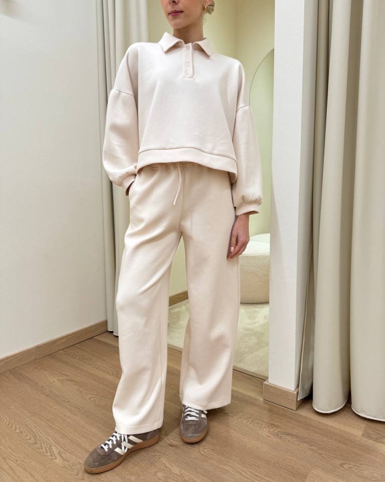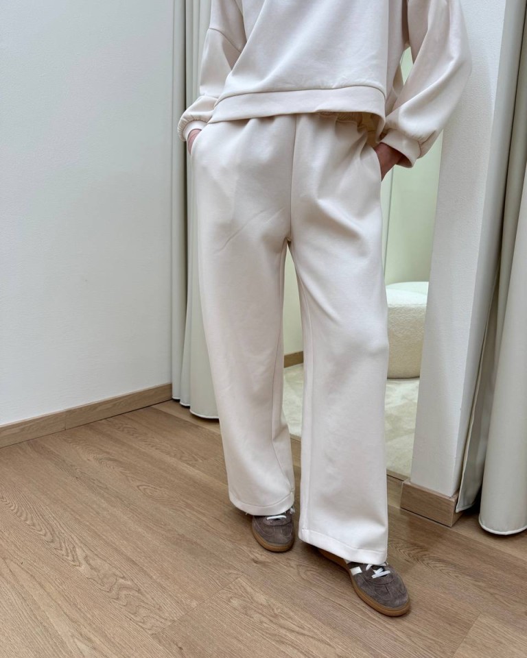 Pantalone in felpa color panna, modello palazzo vita alta con elastico e laccio regolabile interno, tasche laterali. Vestibilità morbida e regolare.