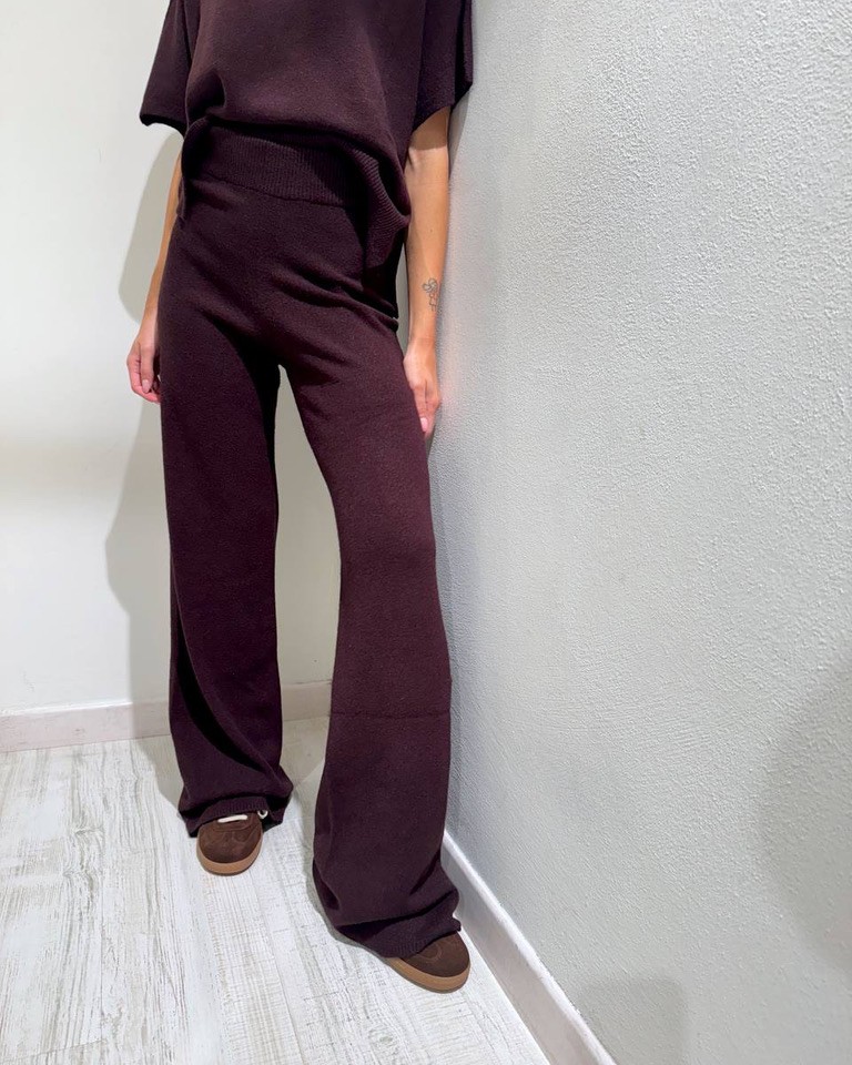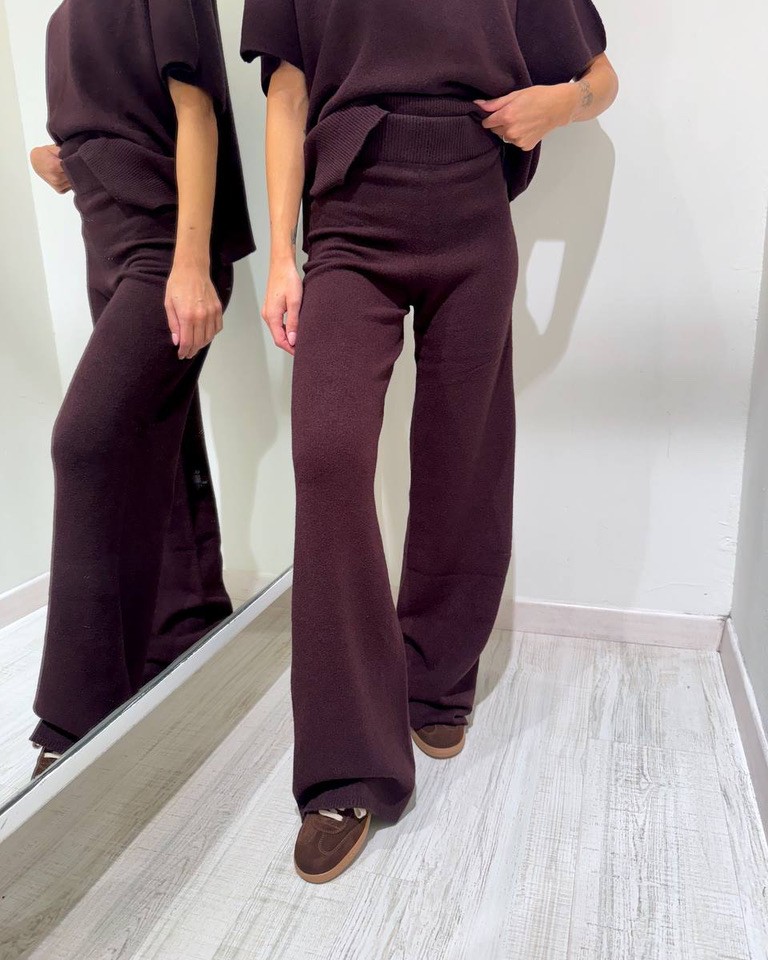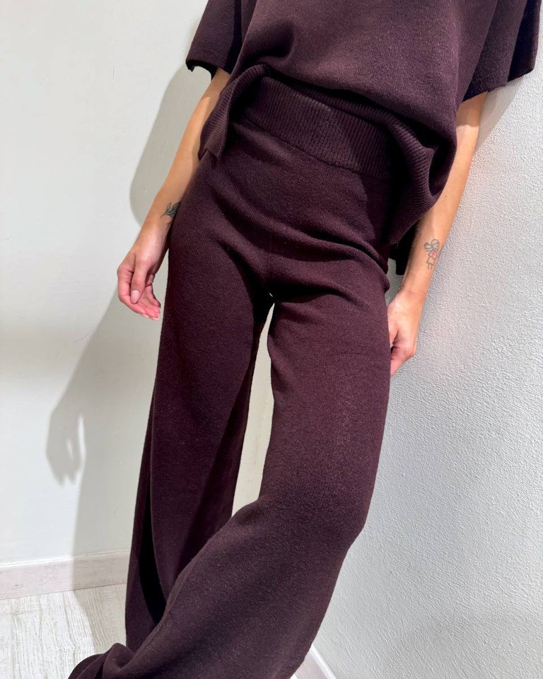 Pantalone in maglia moro in viscosa, modello dritto e vita medio alta con fascia elastica. Vestibilità regolare ed elasticizzata.