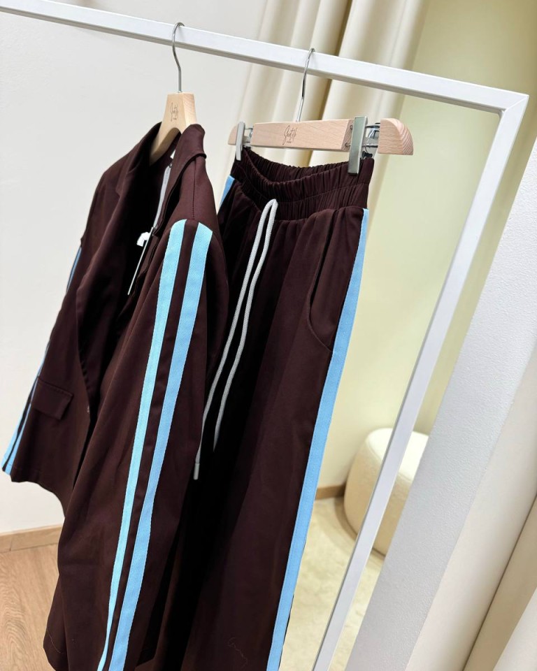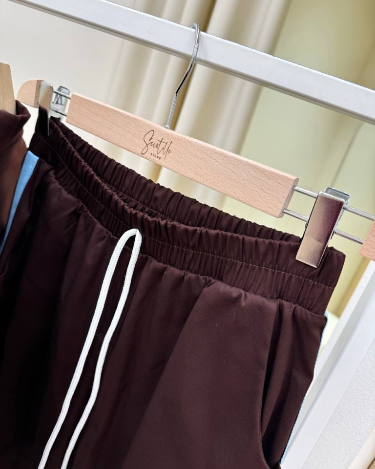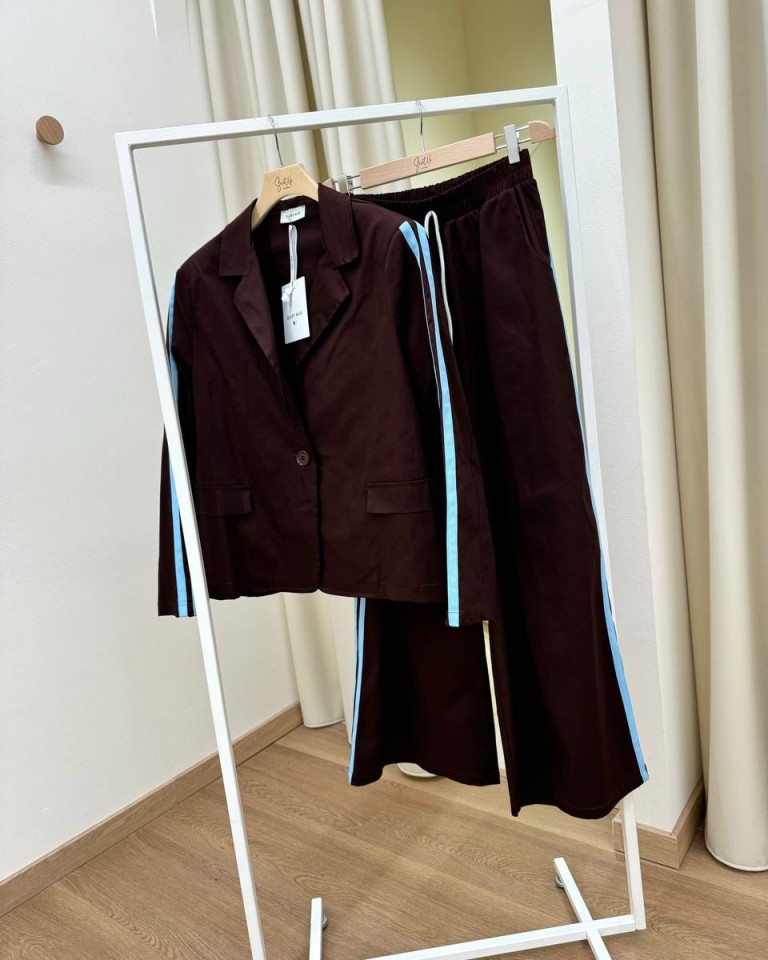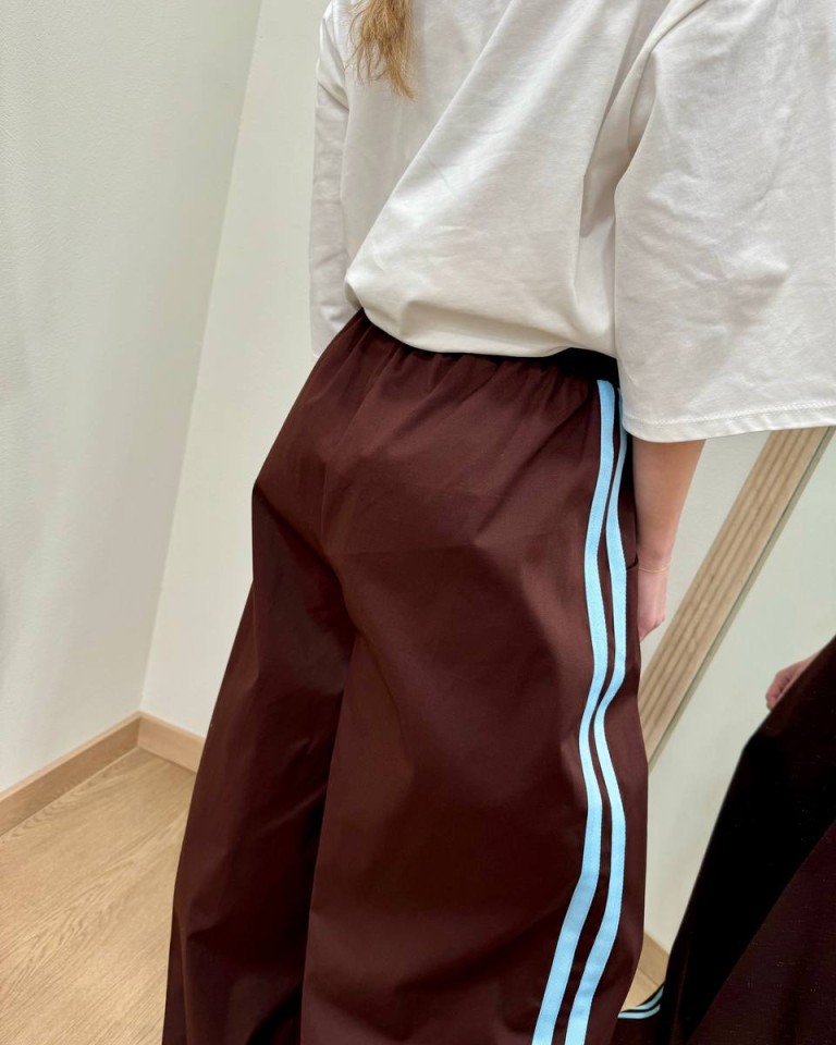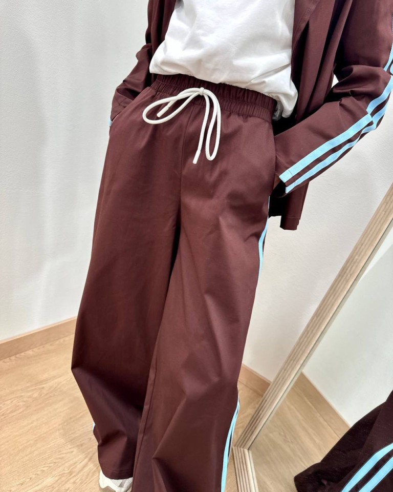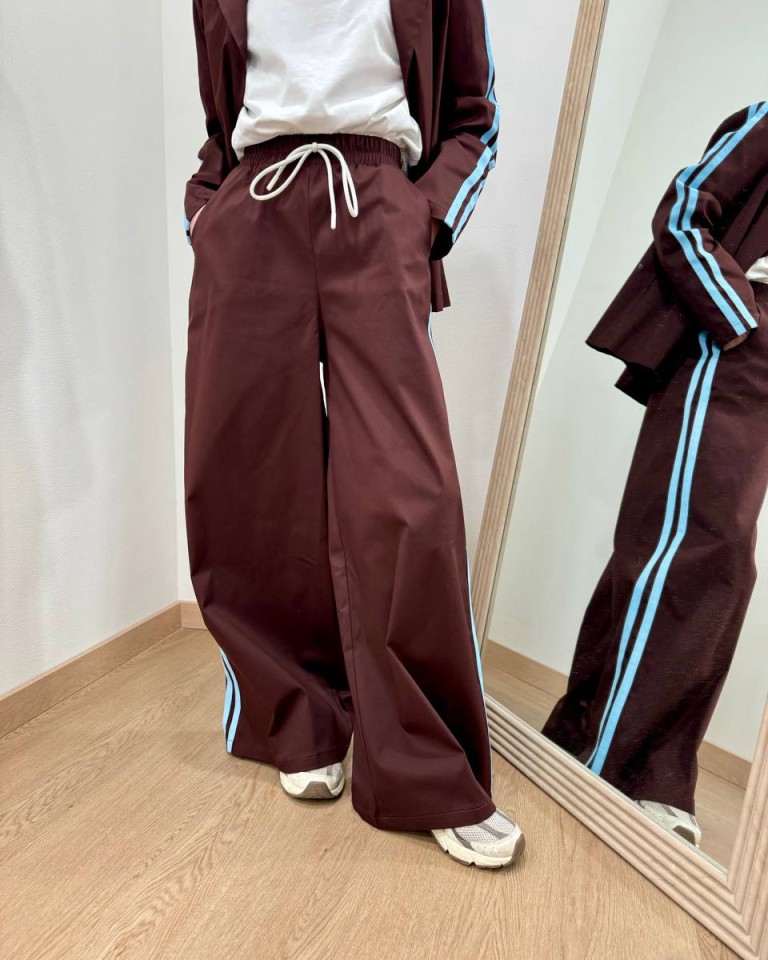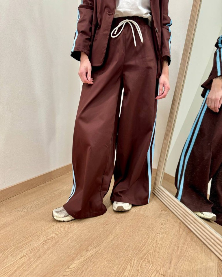 Pantalone color moro con bande laterali a contrasto azzurre, modello a palazzo a gamba larga a vita alta con elastico, finto fiocco in corda bianco davanti, tasche laterali. Vestibilità ampia.