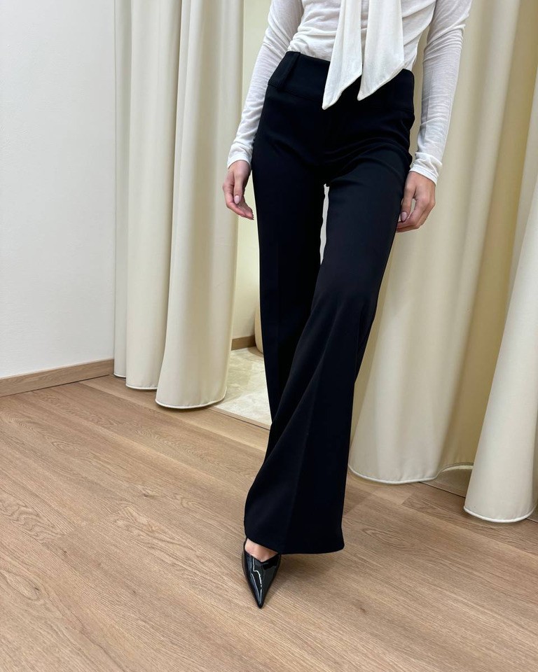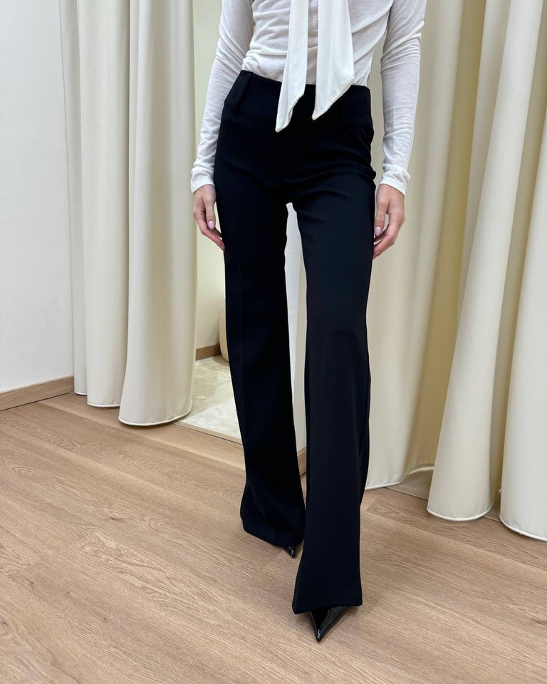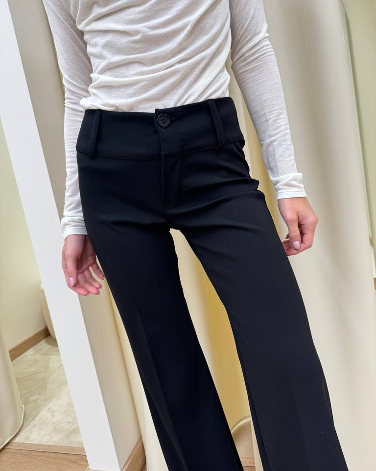 Pantalone color nero in punto milano, modello vita medio alta con fascia elastica e zampetta sul fondo. Vestibilità aderente ed elasticizzata.
