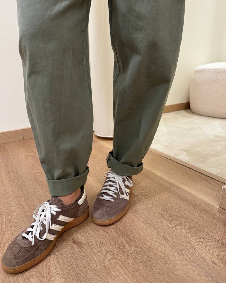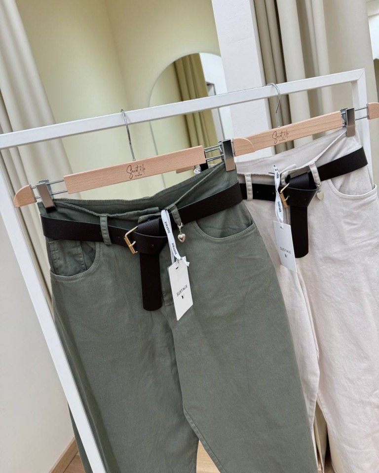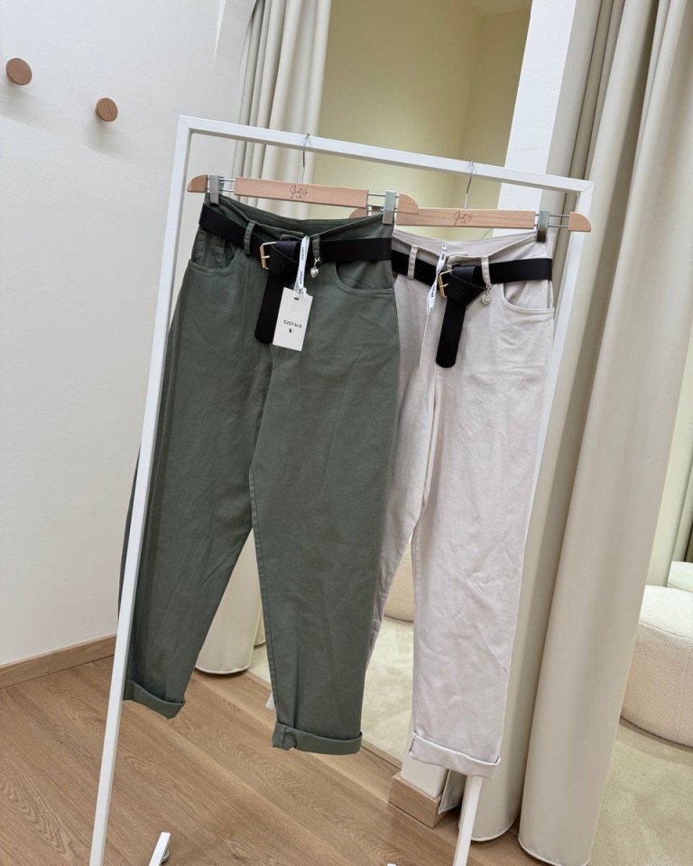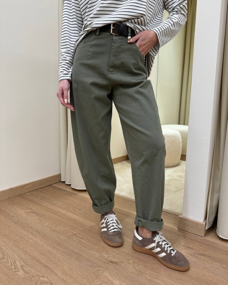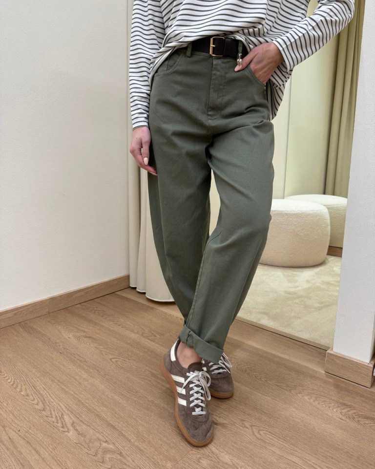 Pantalone verde militare, modello a uovo con rovescia sul fondo, vita alta con cintura moro abbinata regolabile e rimovibile. Cinque tasche. Vestibilità regolare.