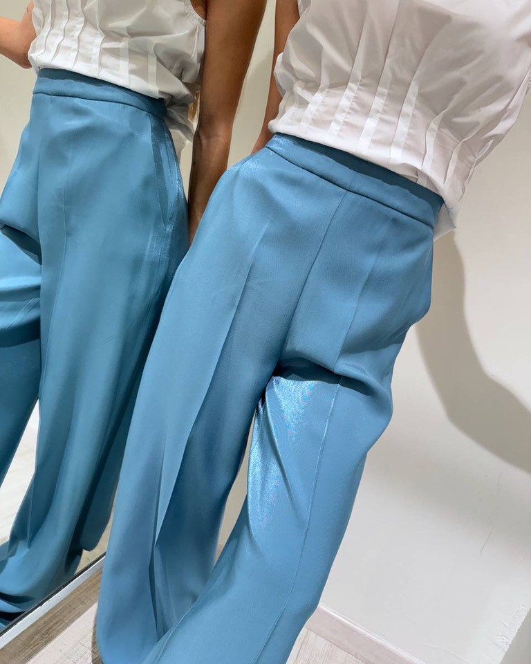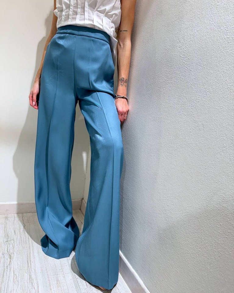 Pantalone in tessuto semilucido con viscosa color carta zucchero. Modello classico a palazzo, piega stirata, vita alta con tasche laterali e chiusura con zip invisibile sul fianco. Vestibilità regolare.