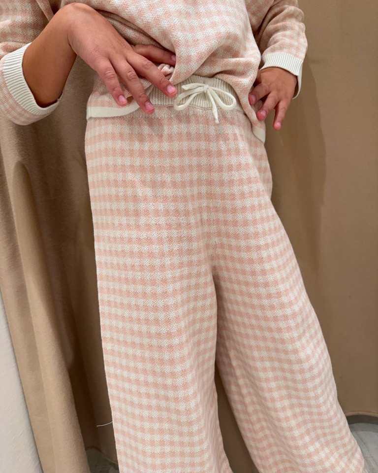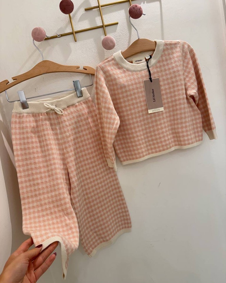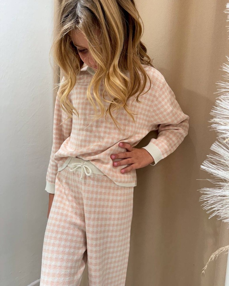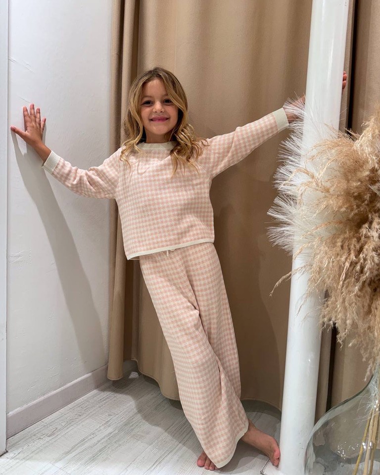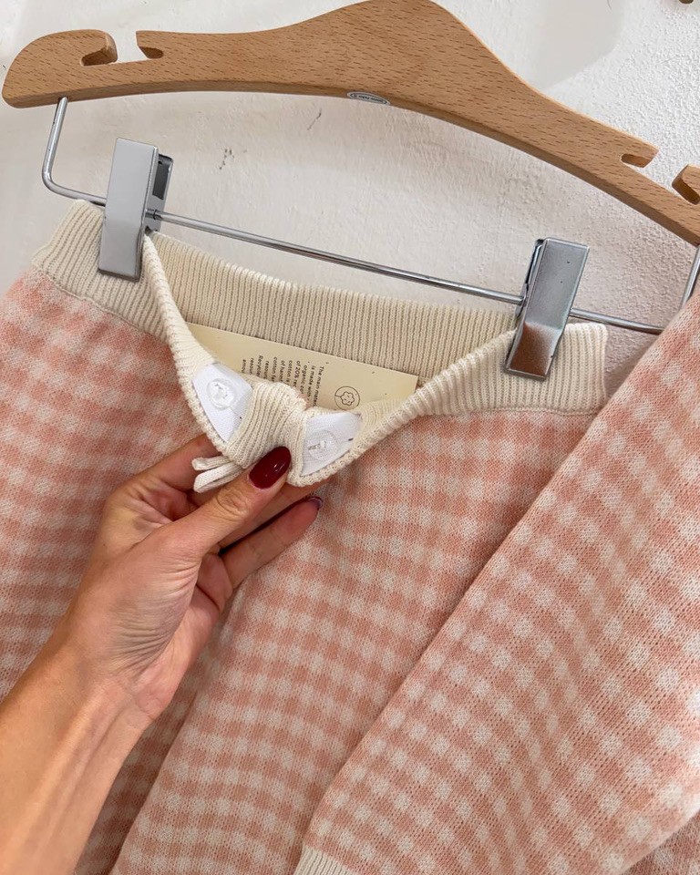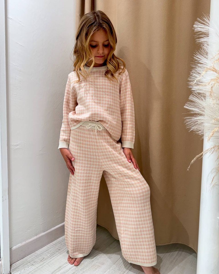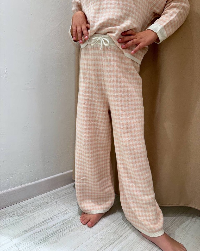 Pantalone palazzo check in maglia burro e rosa Lil’ Atelier