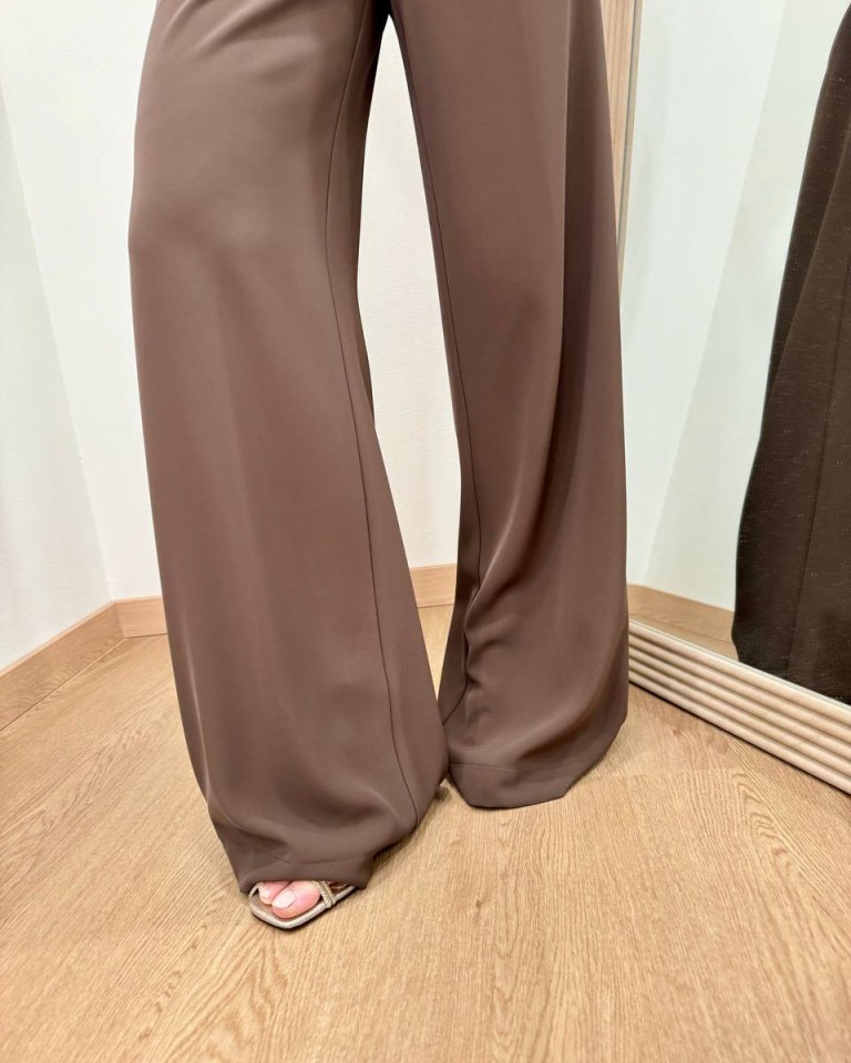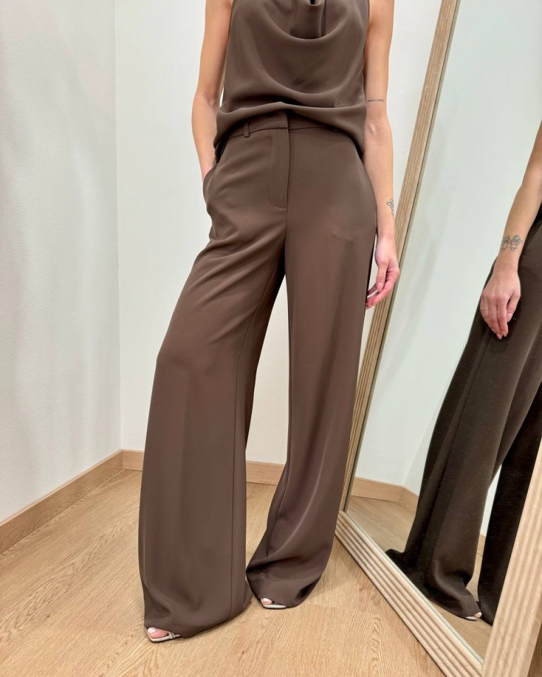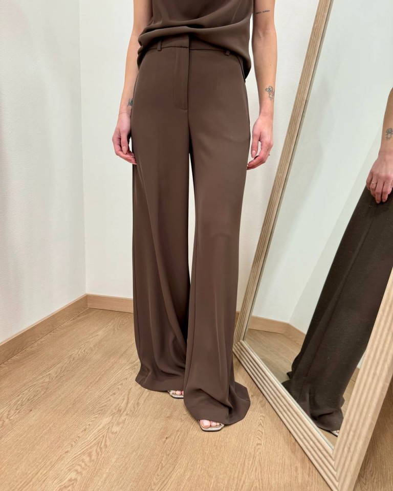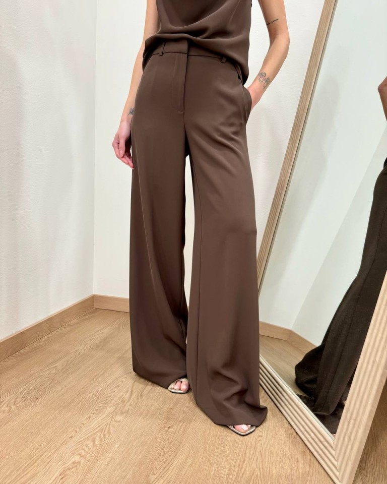 Pantalone moro, modello palazzo fluido con vita alta, tasche laterali e chiusura davanti con zip e bottone. Vestibilità regolare.