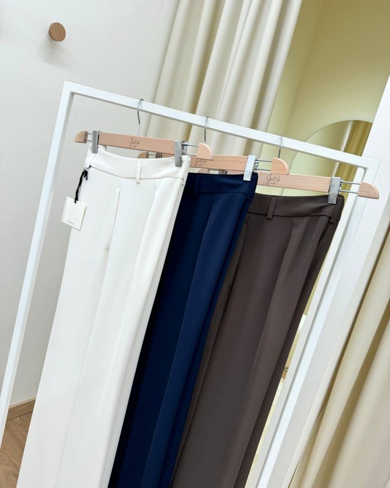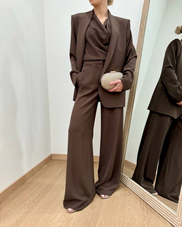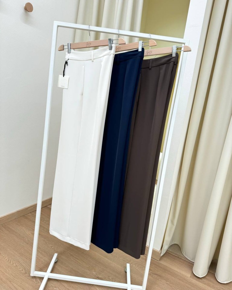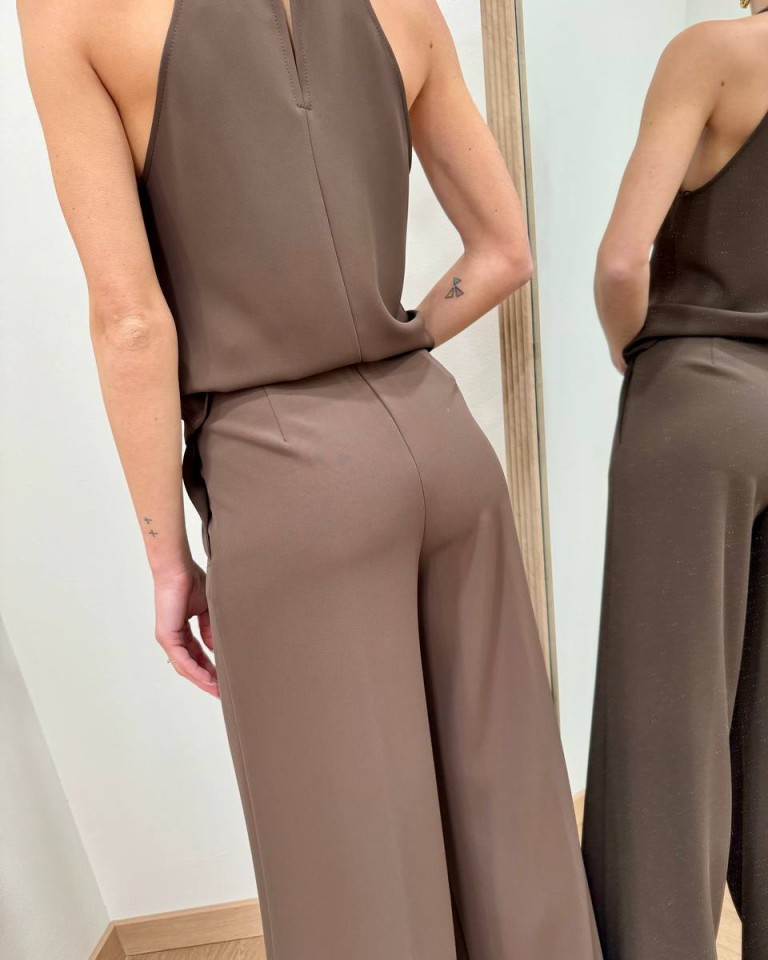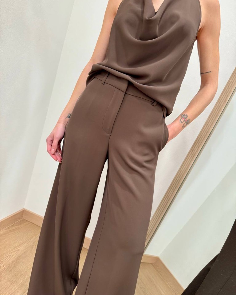 Pantalone moro, modello palazzo fluido con vita alta, tasche laterali e chiusura davanti con zip e bottone. Vestibilità regolare.