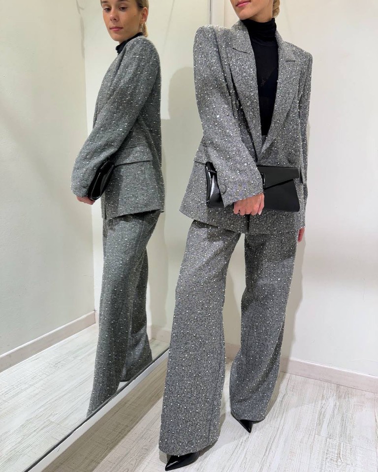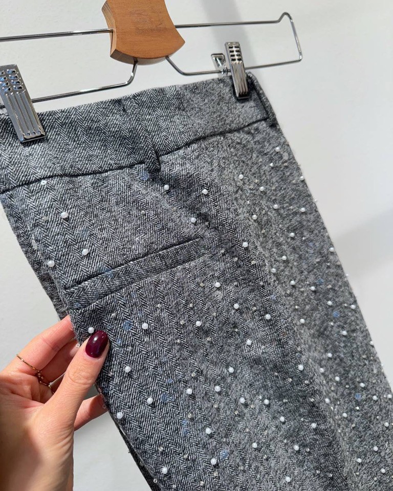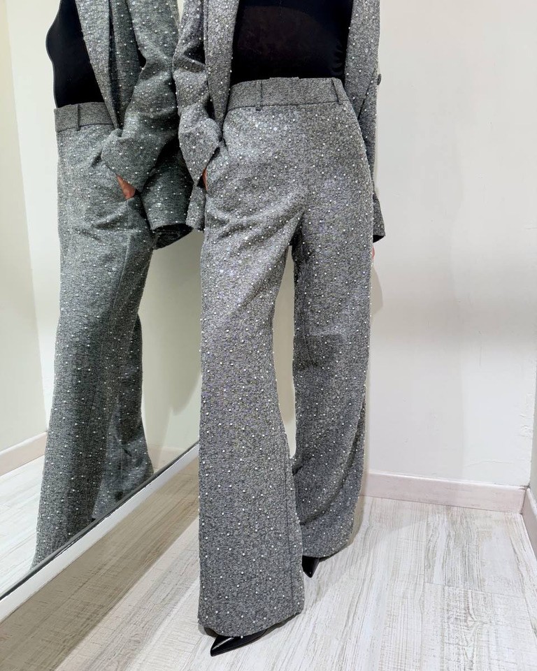 Pantalone palazzo grigio con paillettes e perle Vicolo
