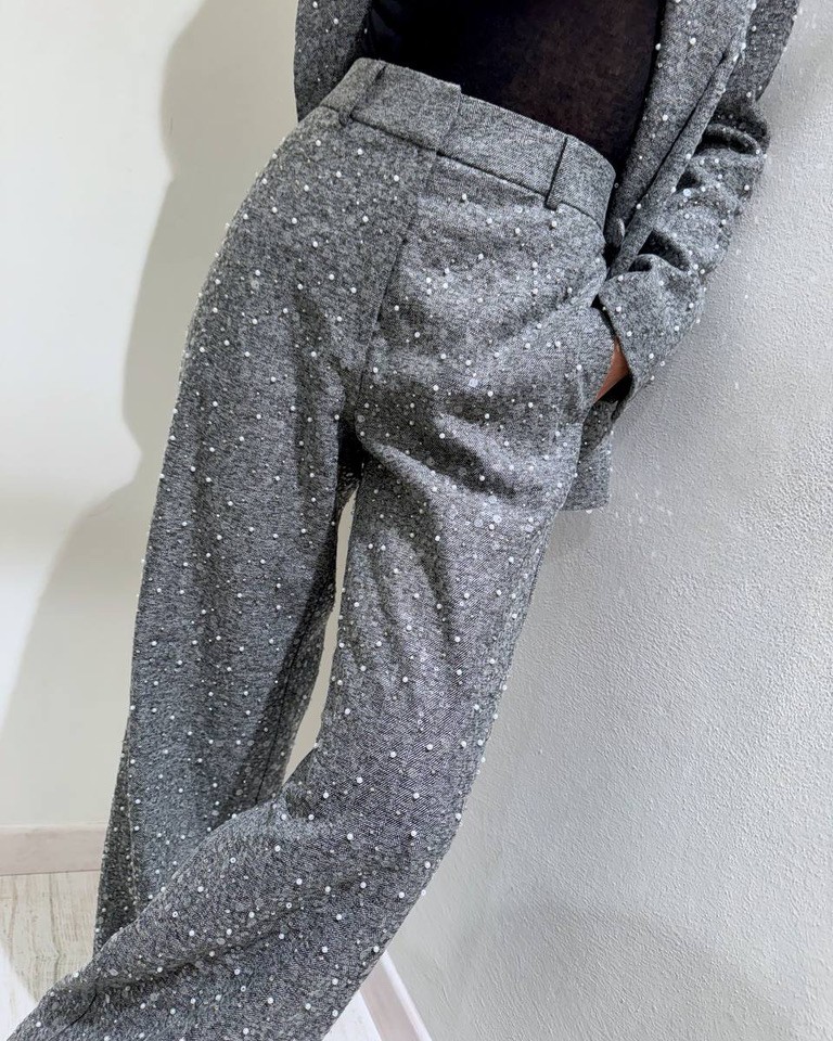 Pantalone grigio ricoperta da applicazione di perle e paillettes, modello palazzo con vita medio alta con chiusura nascosta zip e bottone e passanti. Tasche laterali a filo. Vestibilità regolare.