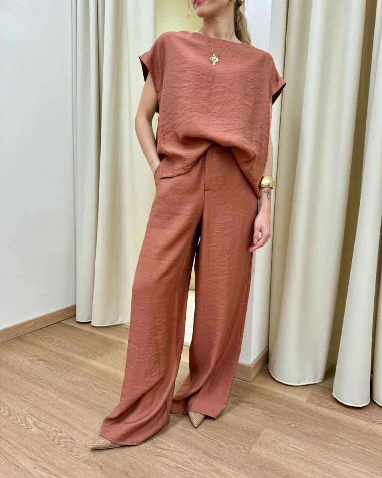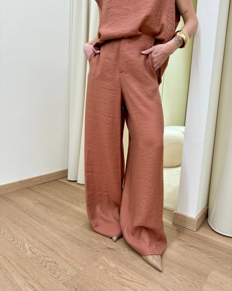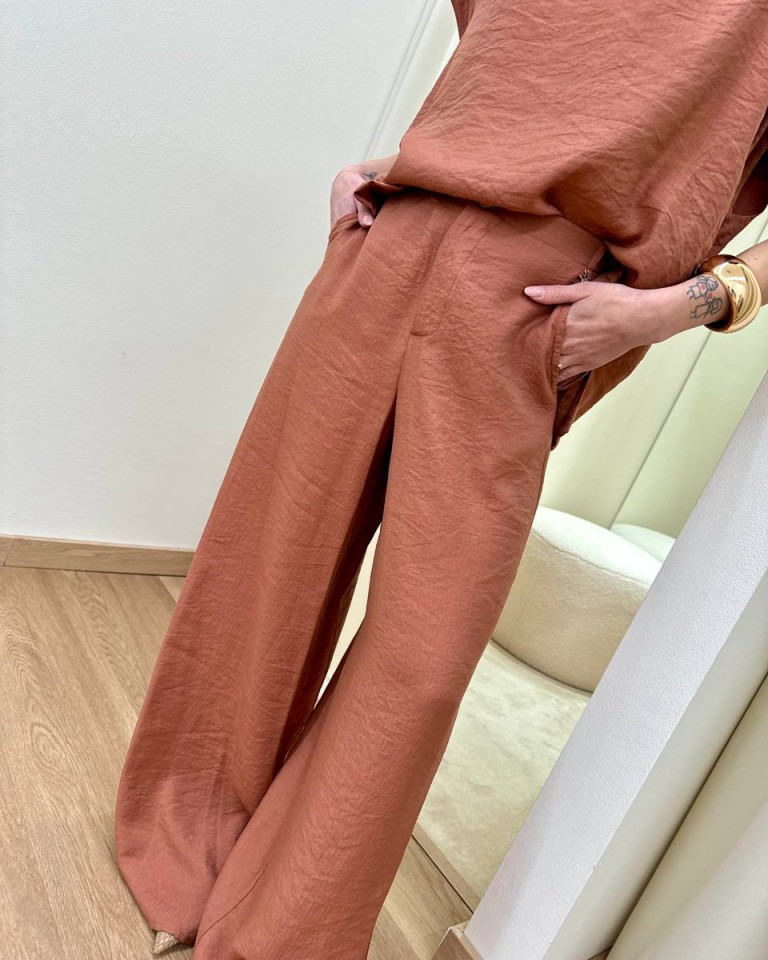 Pantalone color rame, modello a palazzo a gamba larga, vita alta con elastico dietro, tasche laterali e una finta a filetto sul dietro, chiusura con zip e bottone in legno. Vestibilità ampia.